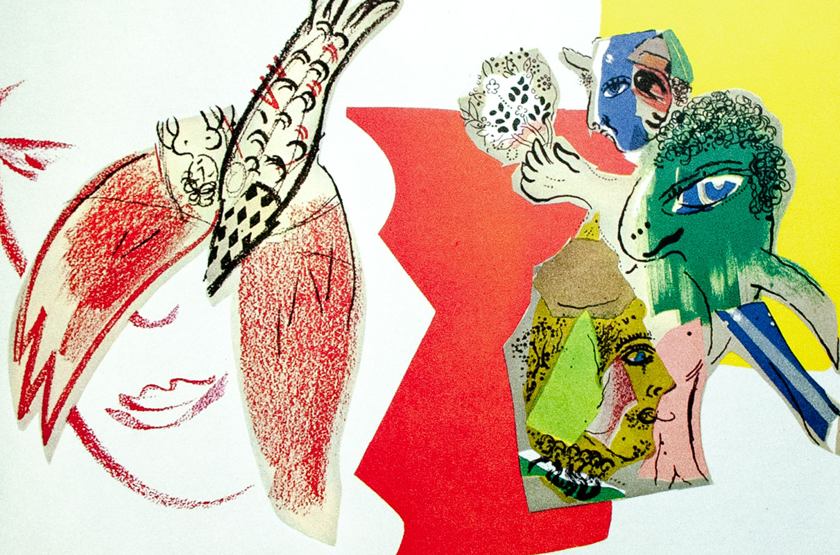 "Chagall's emblematic irrationality shook off all outside influences: color governed his compositions, calling up chimerical processions of memory where reality and the imaginary are woven into a single legend, born in Vitebsk and dreamed in Paris" (Dictionary of Modern Art). His art was aptly described by his biographer as "a troubling alloy of naturalism and magic fiction" (Sidney Alexander). For Chagall, the medium of lithography did not come easily. Printer Fernand Mourlot ran a lithography press where such greats as Braque, Matisse, Picasso, Miró and Chagall came to have their designs printed and to learn about this still nascent print-making process. "For many long months Chagall came and worked tirelessly, and his dissatisfaction allowed him to have only a few of his first attempts printed" (Sorlier, 45). Volumes I and II contain 24 of the original 28 lithographs published throughout the series; the dust jackets and frontispieces of Volumes III and IV account for the remaining four. (Volume V was published near the end of Chagall's life, and Volume VI was published posthumously.