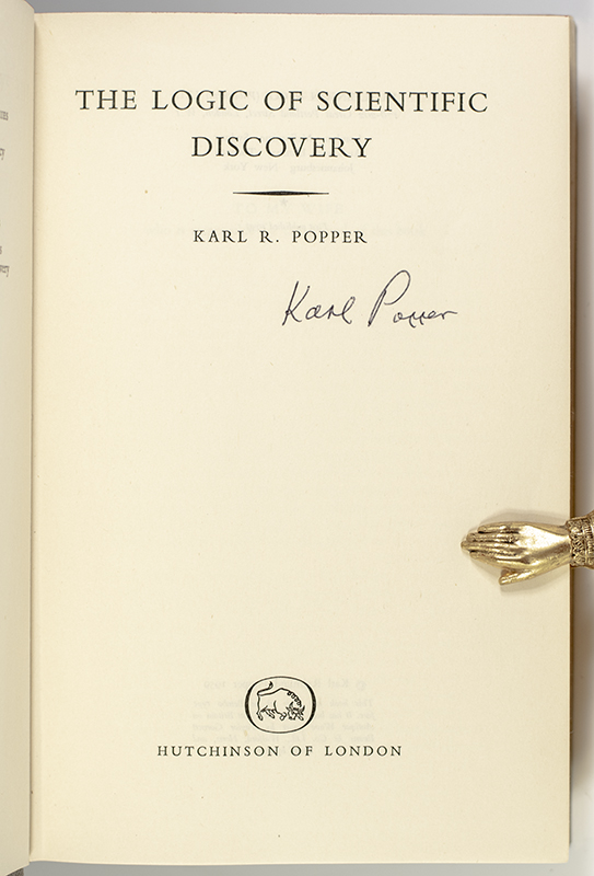 First edition of "one of the most important documents of the twentieth century" (Peter Medawar, New Scientist). Octavo, original cloth. Boldly signed by Karl Popper on the title page. Fine in a near fine dust jacket. Rare and desirable signed.