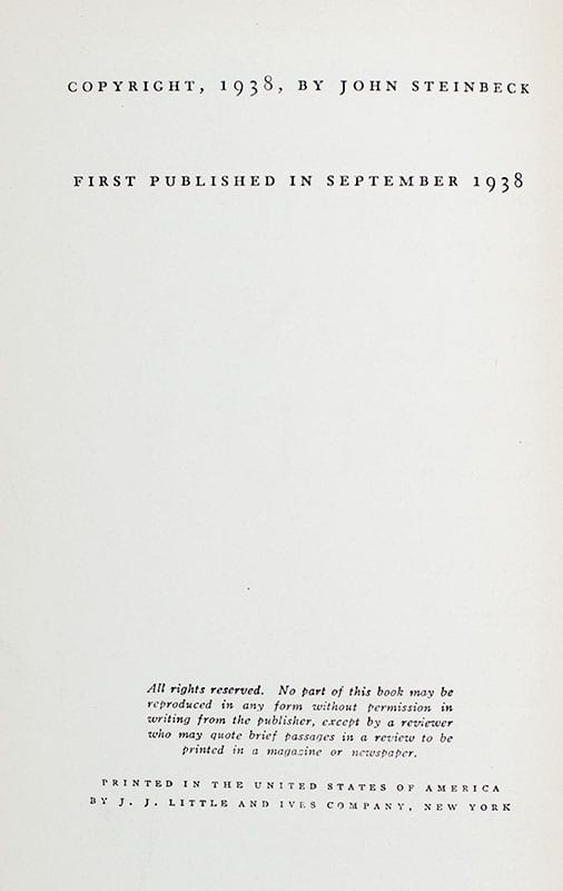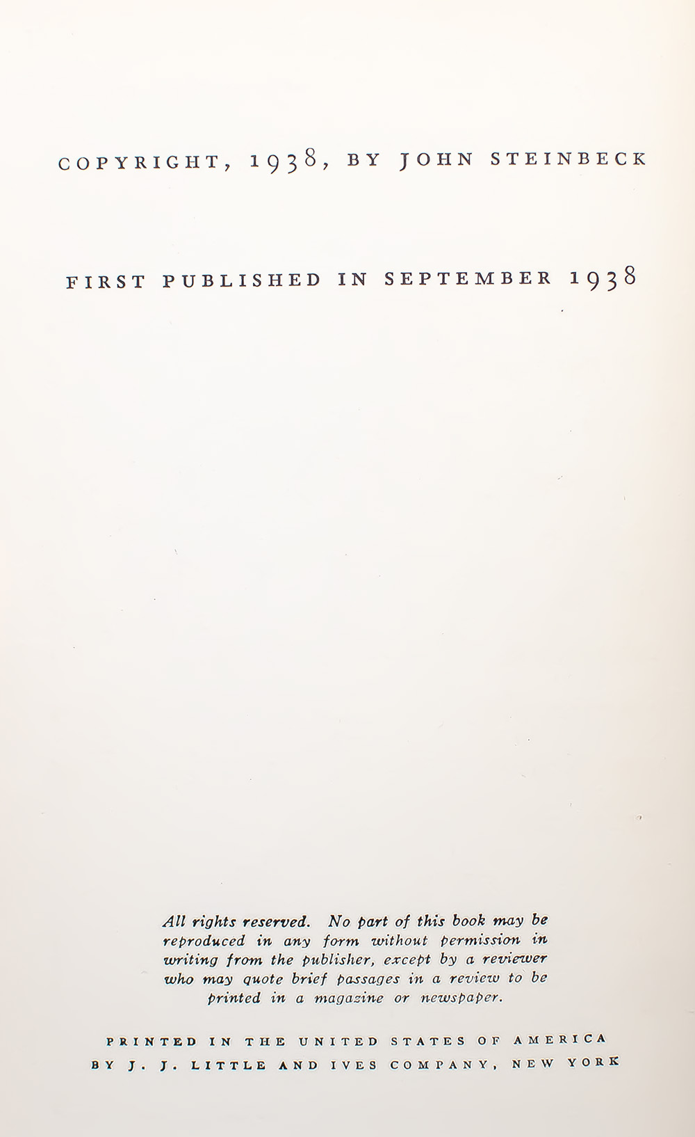 First edition of Steinbeck's collection of 13 stories, which includes "The Red Pony" and "St. Katy the Virgin." Octavo, original cloth. Near fine in a very good dust jacket. Jacket design by Elmer Hader. Goldstone-Payne A11.a. Housed in a custom half morocco clamshell box. An exceptional example.