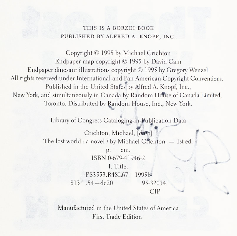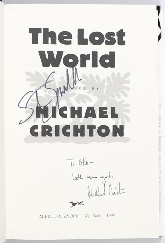 First edition of Crichton's sequel to Jurassic Park. Octavo, original half cloth, cartographic endpapers. Presentation copy, inscribed by Michael Crichton on the title page, "To Otto- with warm regards Michael Crichton" Additionally signed by Steven Spielberg who directed the 2015 film adaptation, and Chip Kidd with an original drawing mimicking the dust jacket art which he designed on the half-title page. Additionally signed by Kidd on the rear flap of the dust jacket. Fine in a fine dust jacket. Jacket design by Chip Kidd.