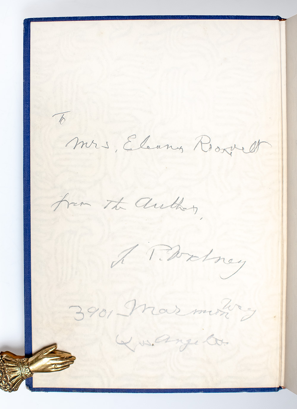Limited first edition, one of one thousand copies of this collection of poems about the Pacific Coast. Octavo, original cloth with gilt titles to the spine and front panel, frontispiece, illustrated with black and white photographs. Association copy, inscribed by the author on the front pastedown, "To Mrs. Eleanor Roosevelt from the author, J.P. Widney." The recipient, Eleanor Roosevelt was a political figure, diplomat, and activist. She was the longest-serving first lady of the United States, during her husband Franklin D. Roosevelt's four terms as president from 1933 to 1945. Through her travels, public engagement, and advocacy, she largely redefined the role. Widowed in 1945, she served as a United States Delegate to the United Nations General Assembly from 1945 to 1952, and took a leading role in designing the text and gaining international support for the Universal Declaration of Human Rights. In 1948, she was given a standing ovation by the assembly upon their adoption of the declaration. President Harry S. Truman later called her the "First Lady of the World" in tribute to her human rights achievements. In very good condition with rubbing.