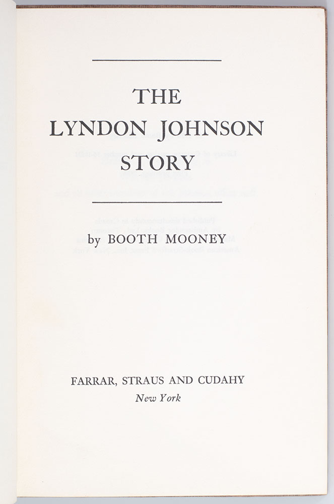 First edition of Booth Mooney's biography of Lyndon B. Johnson. Octavo, original cloth, illustrated with photographs. Presentation copy, warmly inscribed by Lyndon B. Johnson on the front free endpaper, "For my friend Clay Coogins from his friend Lyndon B. Johnson." In near fine condition.