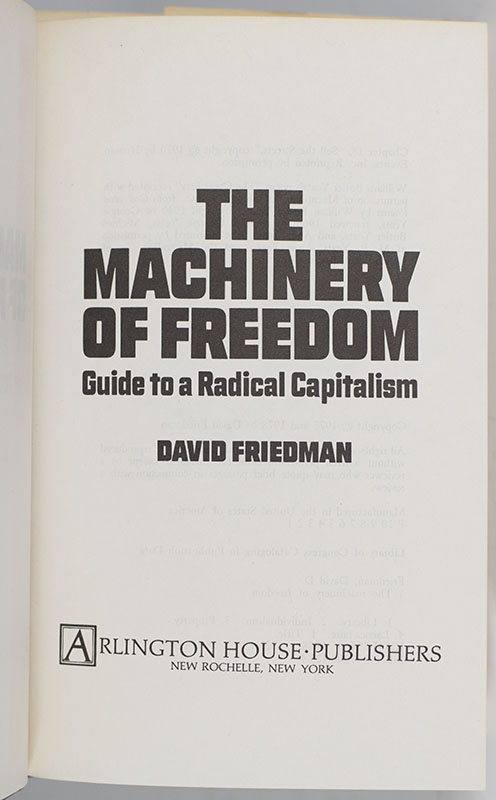 First Edition of David Friedman's The Machinery of Freedom. Guide to a Radical Capitalism; Inscribed by Him