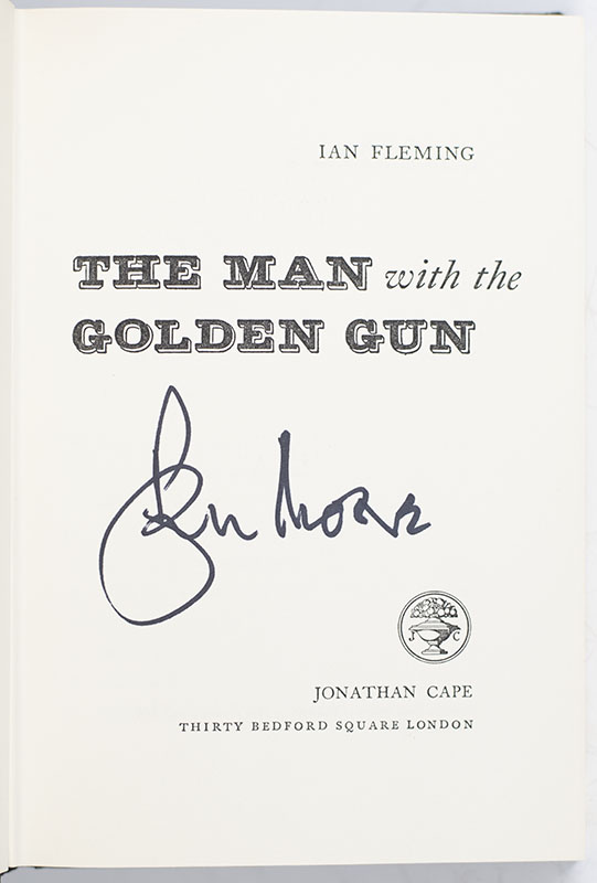 First edition of the twelfth novel of Ian Fleming's James Bond series. Octavo, original black cloth, green patterned endpapers. Boldly signed by Roger Moore on the title page. Moore played 007 in the film in the movie adaption. Fine in a near fine dust jacket. Dust jacket design by Richard Chopping.