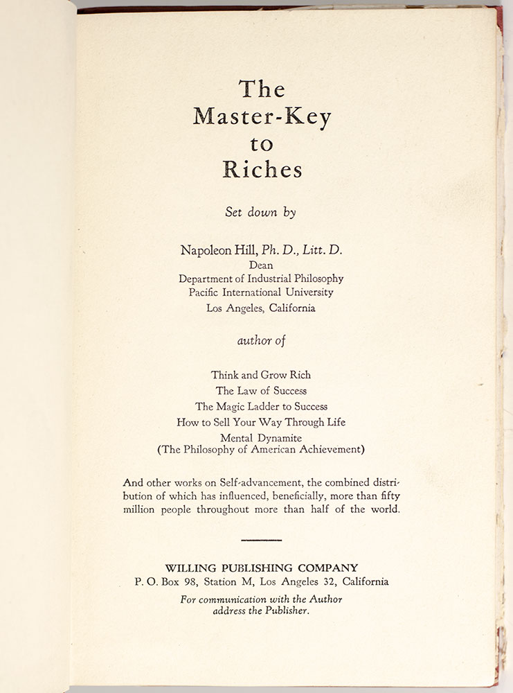 “A definite purpose, backed by absolute faith, is a form of wisdom and wisdom in action produces positive results": First Edition of Napoleon Hill's The Master Key to Riches