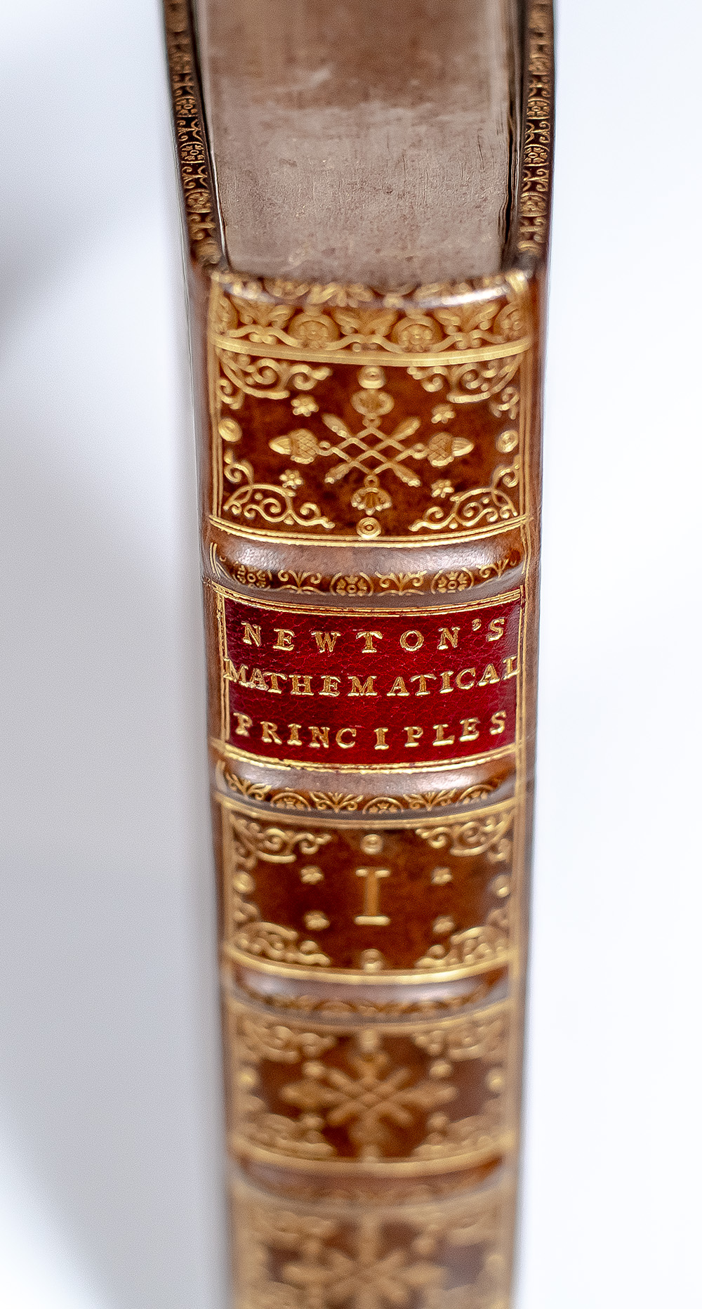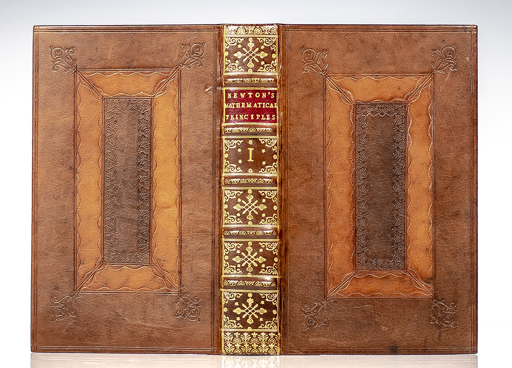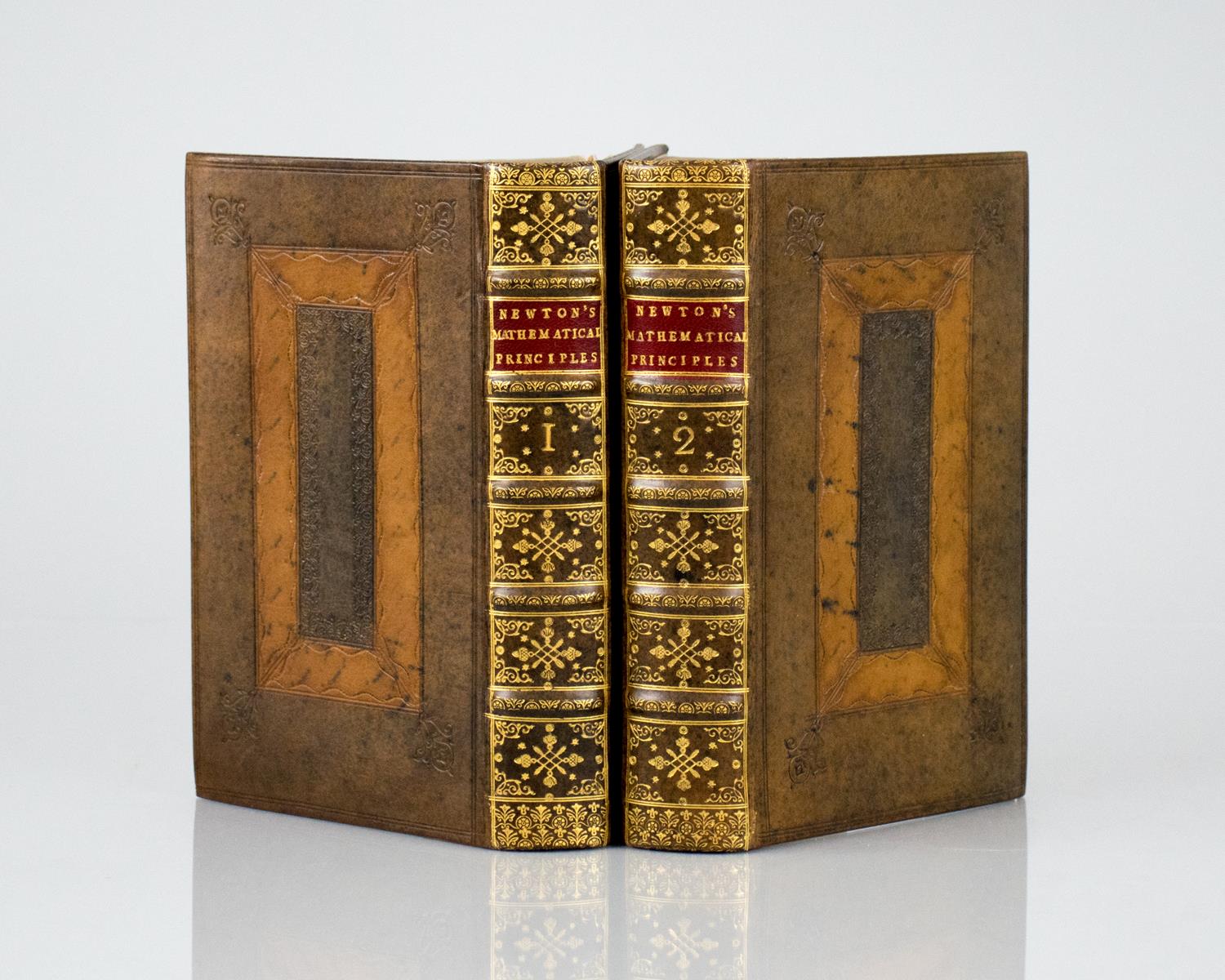 First edition in English of Isaac Newton’s Principia. Octavo, two volumes bound in full calf with gilt titles and tooling to the spine in six compartments within raised gilt bands, morocco spine labels lettered in gilt, gilt turn-ins, illustrated with forty-six folding engraved plates and two folding charts. In near find condition. A few leaves with light foxing, pages lightly toned. Plate XXV at the end of volume one supplied in facsimile. An excellent example of this landmark work.