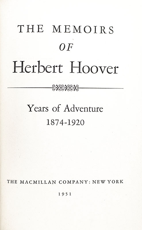 First Edition of The Memoirs of Herbert Hoover: 1874-1920 Years of Adventure; Signed by Herbert Hoover
