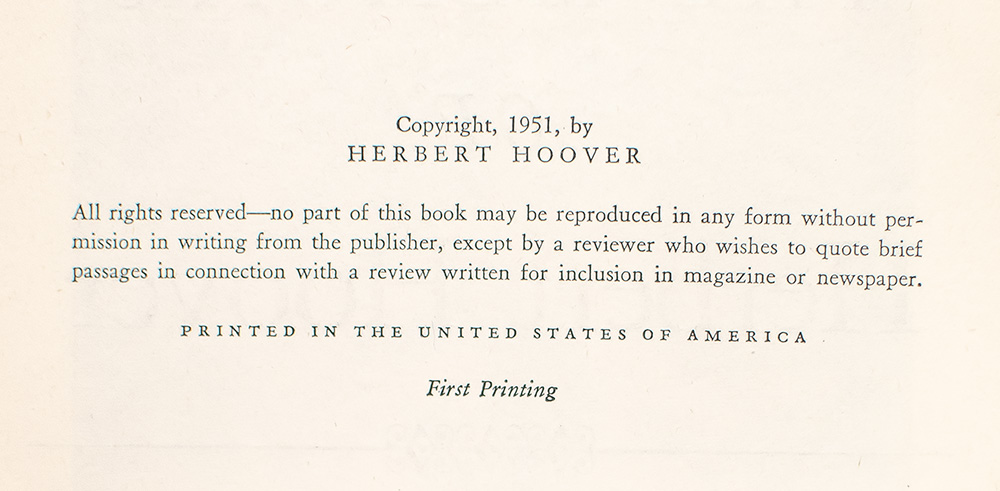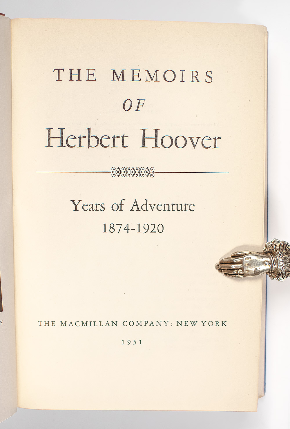 First editions of each volume in Hoover’s memoirs. Octavo, 3 volumes, illustrated with black and white photographs. Each are near fine in very good dust jackets. Includes: Volume One: Years of Adventure 1874-1920; The Cabinet and the Presidency 1920-1933; The Great Depression 1929-1941. A charming set, uncommon in the first printing.