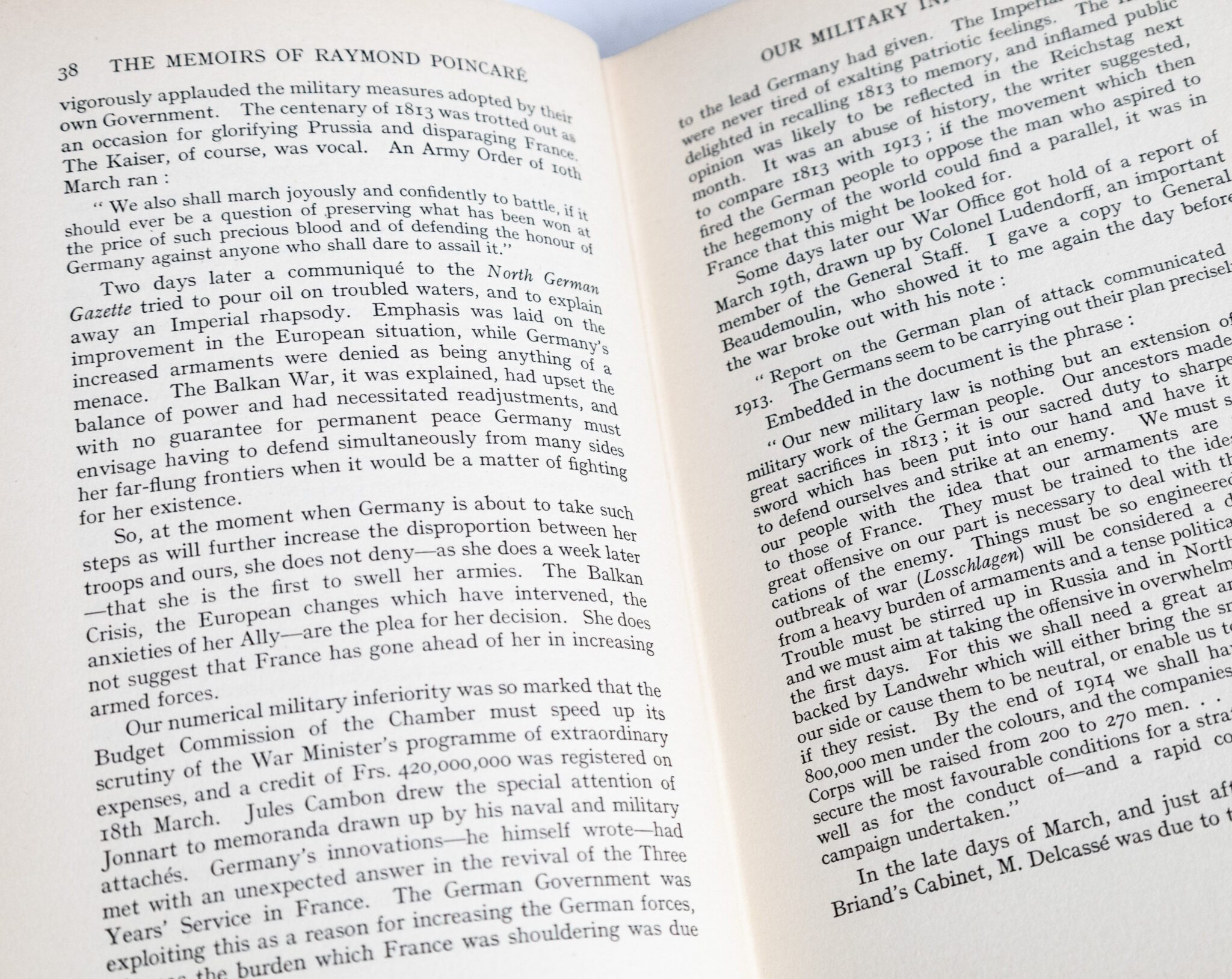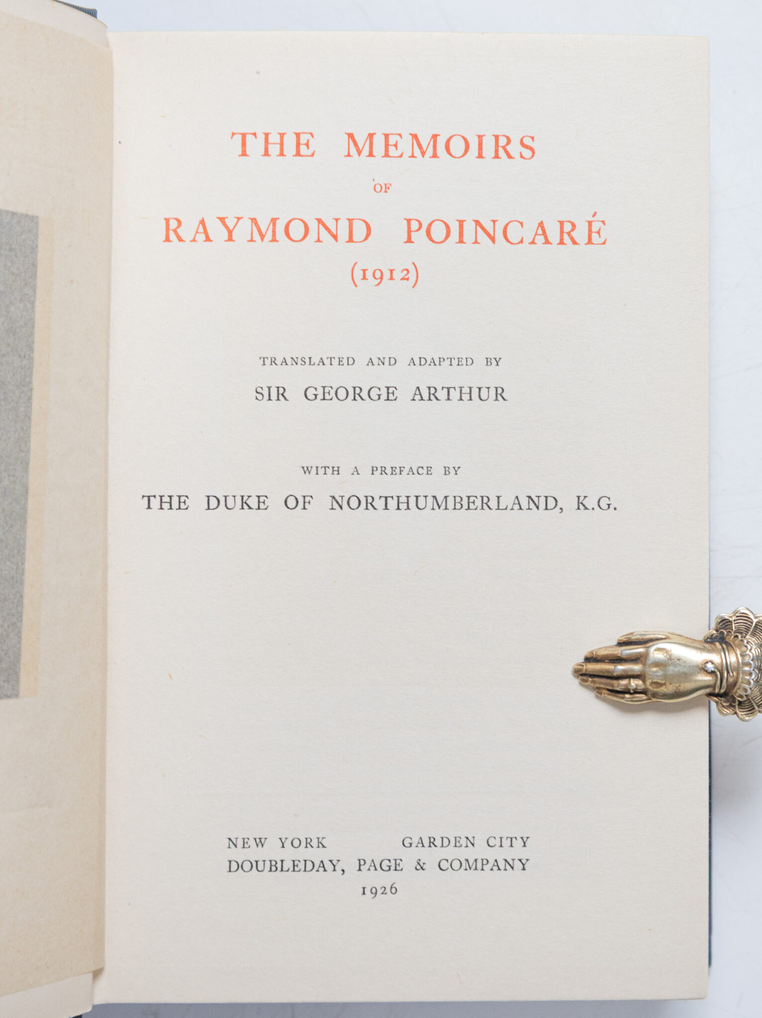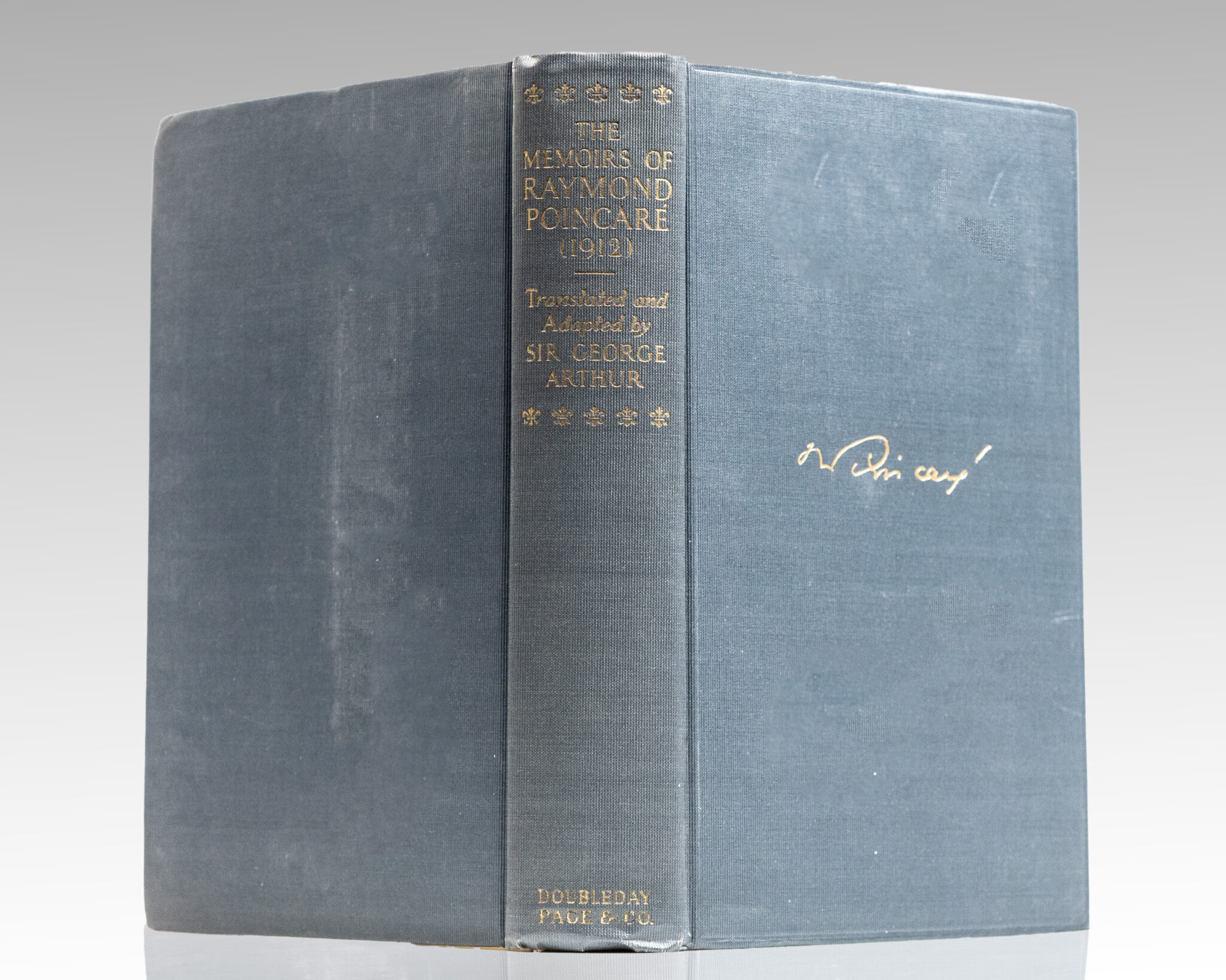First American edition of this first-hand, detailed account of French foreign policy, diplomacy, and the events leading to World War I. Octavo, the first three volumes out of four, original publisher's cloth with gilt titles to the spines, facsimile signature of Raymond Poincaré stamped in gilt to the front panels, tissue-guarded frontispiece to volume one. Boldly signed and dated 1928 by Raymond Poincaré on the front free endpaper of volume one. In very good condition. Translated and adapted by Sir George Arthur. Preface by the Duke of Northumberland, K.G.