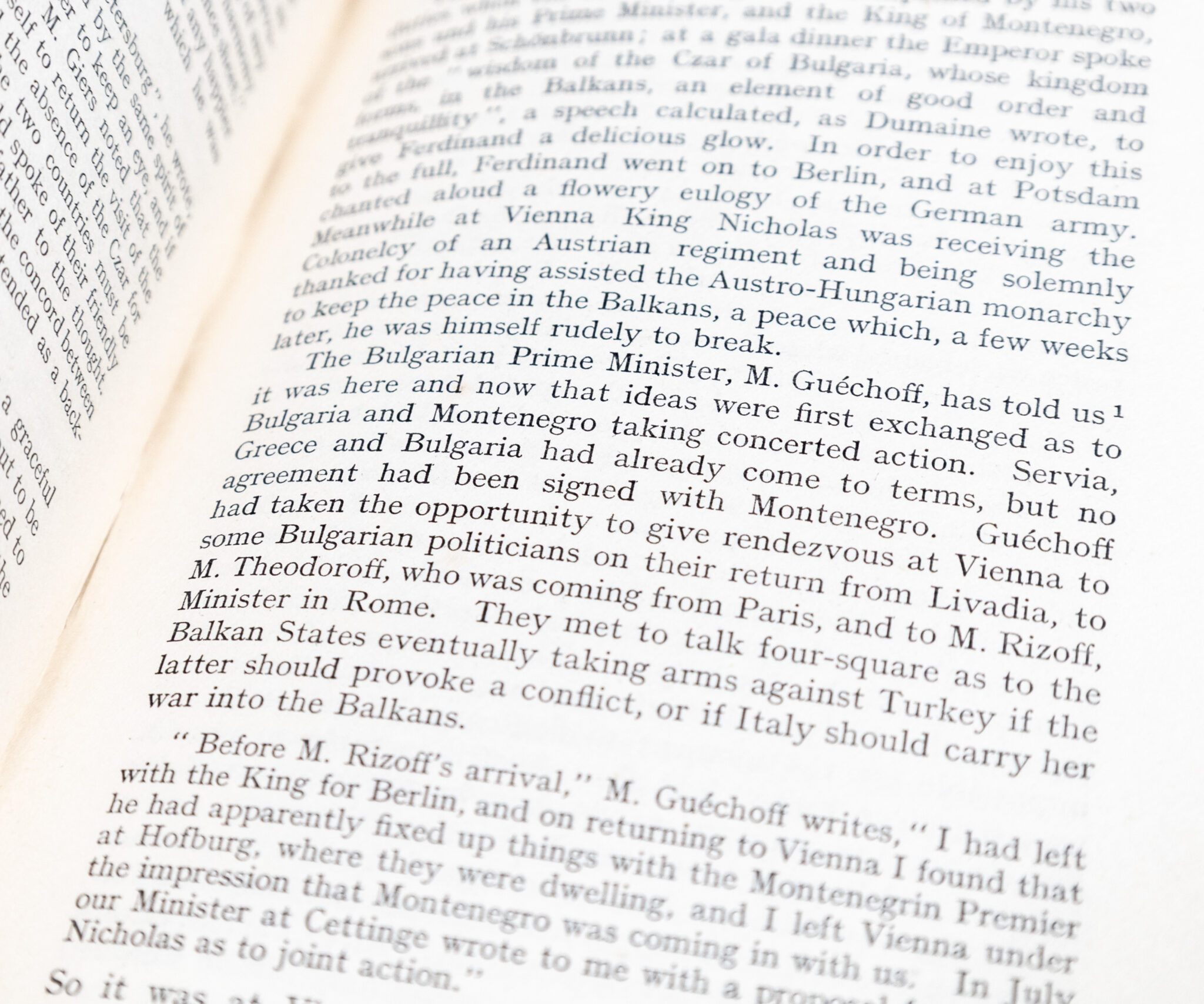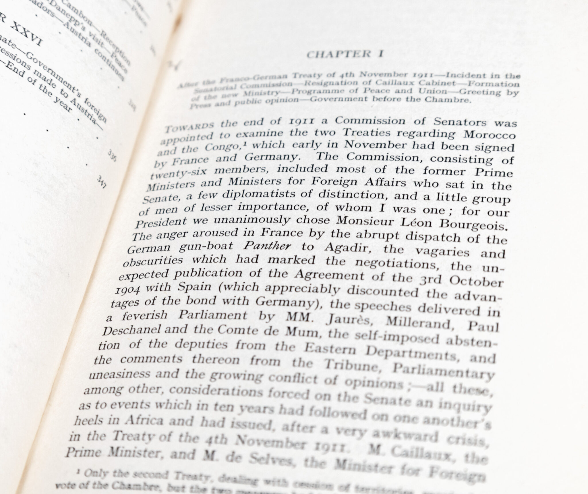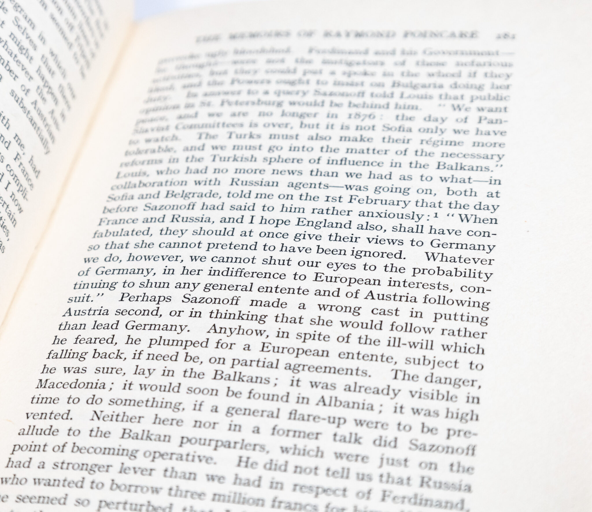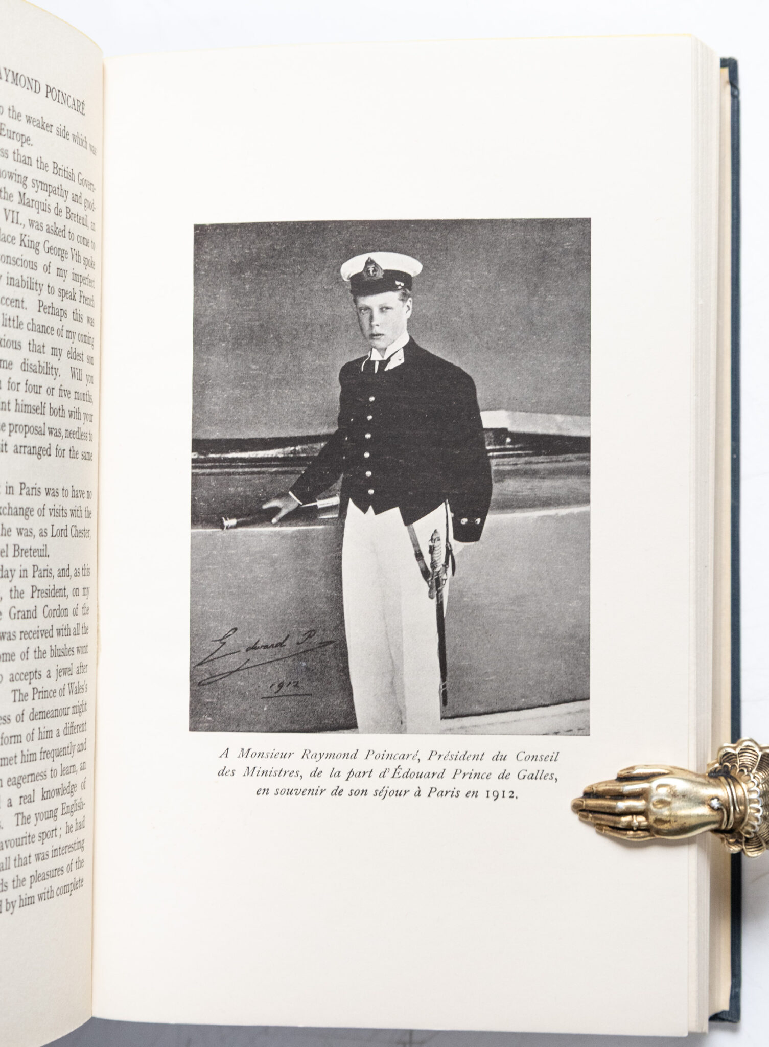 First American edition of this first-hand, detailed account of French foreign policy, diplomacy, and the events leading to World War I. Octavo, the first three volumes out of four, original publisher's cloth with gilt titles to the spines, facsimile signature of Raymond Poincaré stamped in gilt to the front panels, tissue-guarded frontispiece to volume one. Boldly signed and dated 1928 by Raymond Poincaré on the front free endpaper of volume one. In very good condition. Translated and adapted by Sir George Arthur. Preface by the Duke of Northumberland, K.G.