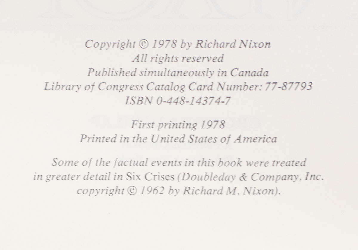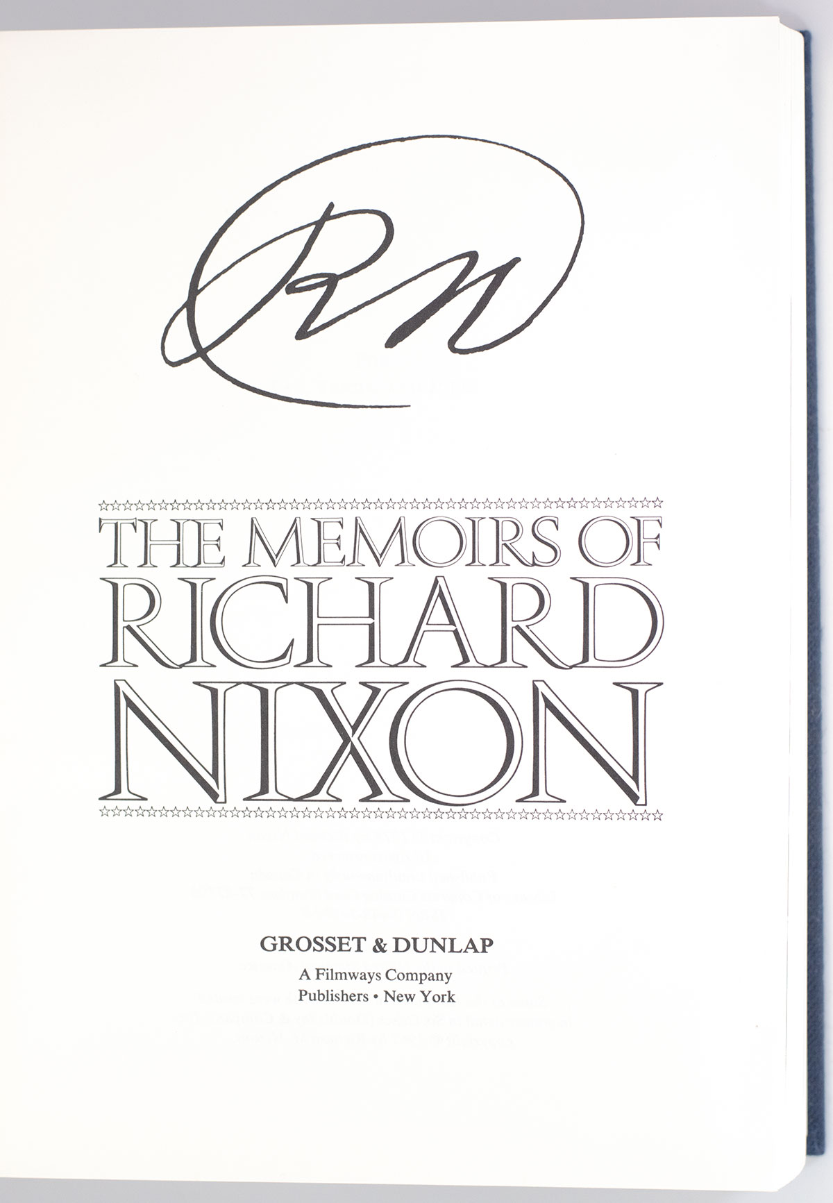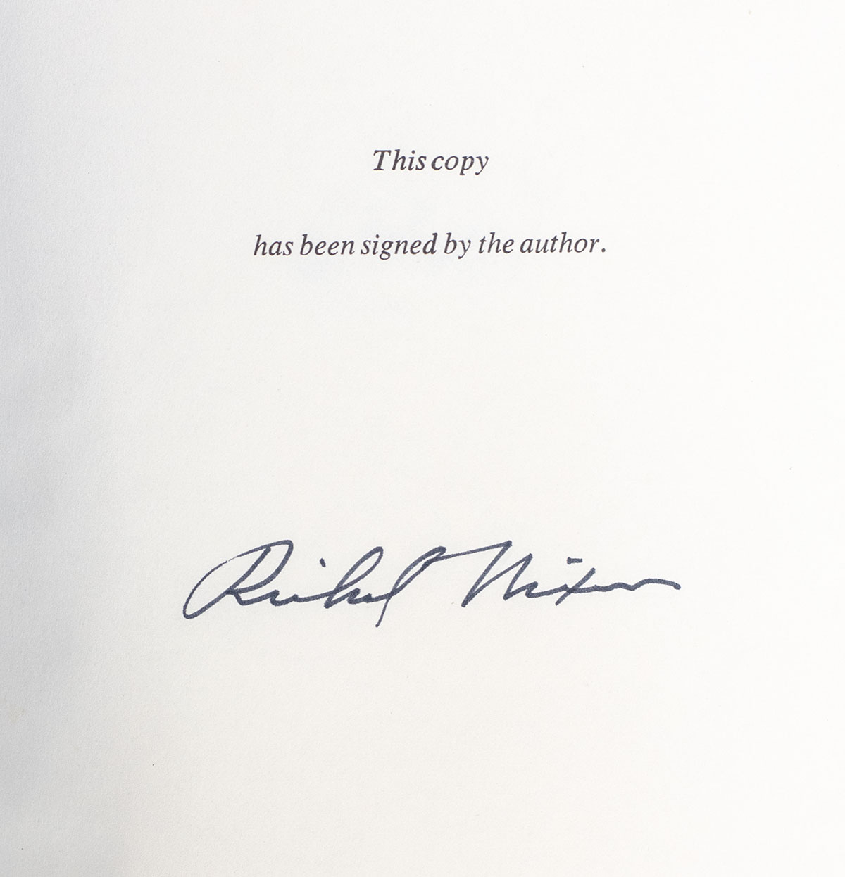Signed limited edition of Richard Nixon's memoirs. Thick octavo, original cloth, illustrated, original slipcase. Boldly signed by Richard Nixon. In near fine condition in the original slipcase. A nice association.