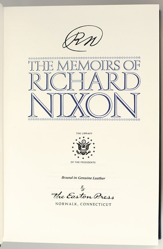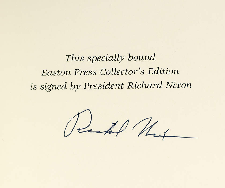 Signed limited edition of Nixon's memoirs. Octavo, bound in full leather, gilt titles and tooling to the spine, front and rear panels, raised bands, all edges gilt, endpapers bearing the presidential seal, illustrated. Boldly signed by Richard Nixon. In fine condition.