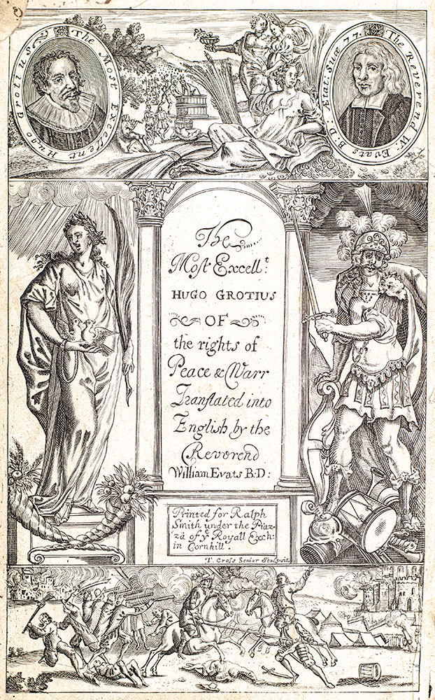 Third edition in English of Higo Grotius' foundational work on international law.  Folio, bound in full contemporary paneled calf with a burgundy morooco spine label lettered in gilt, title page printed in red and black, added engraved title by T. Cross Senior bound opposite the printed title page. Translated into English by William Evats. In good condition. Armorial bookplate and period ownership signature.
