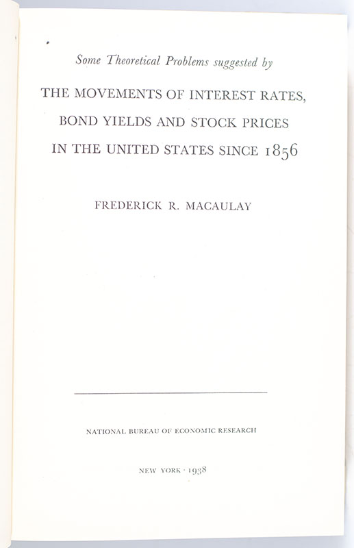 First edition of the work known for introducing the concept of bond duration. Octavo, original blue cloth. Near fine in the rare original dust jacket with some wear and tear. With a preface by Wesley C. Mitchell.