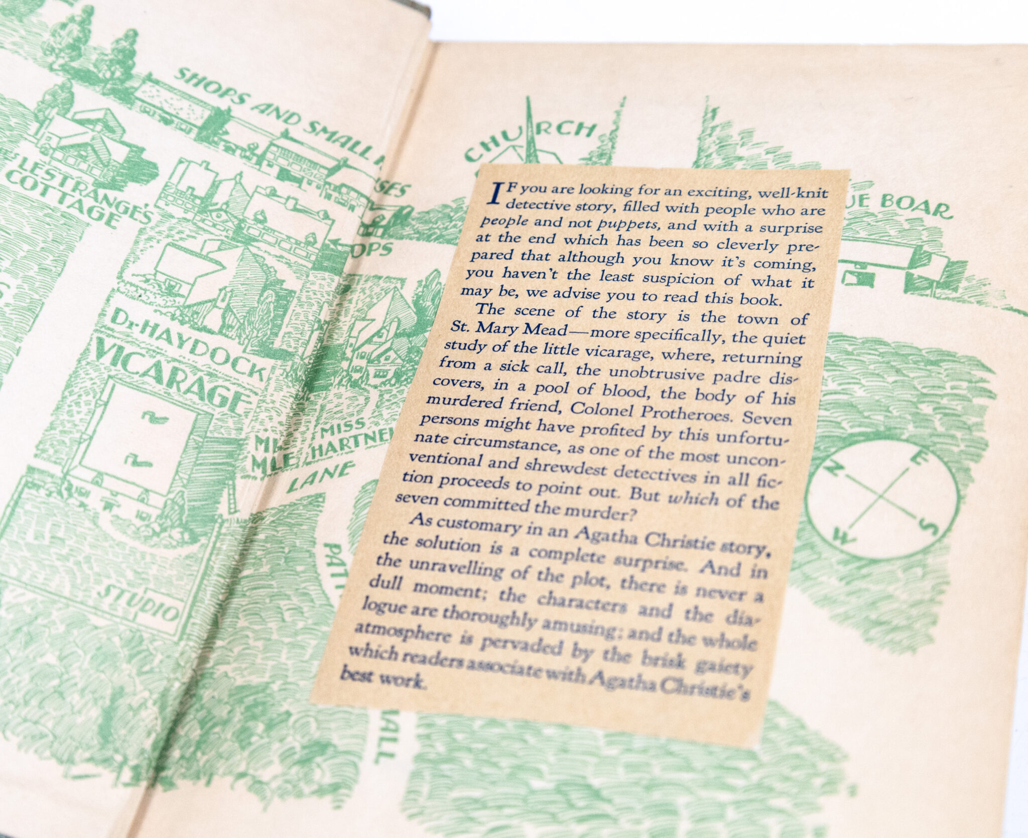 First American edition of this classic detective novel introducing one of Christie's most enduring and influential detectives, Miss Marple. Octavo, original publisher's green cloth, cartographic endpapers, with a clipping of the book summary adhered to the front free endpaper. In very good condition. From the collection of Dr. John Talbot Gernon.