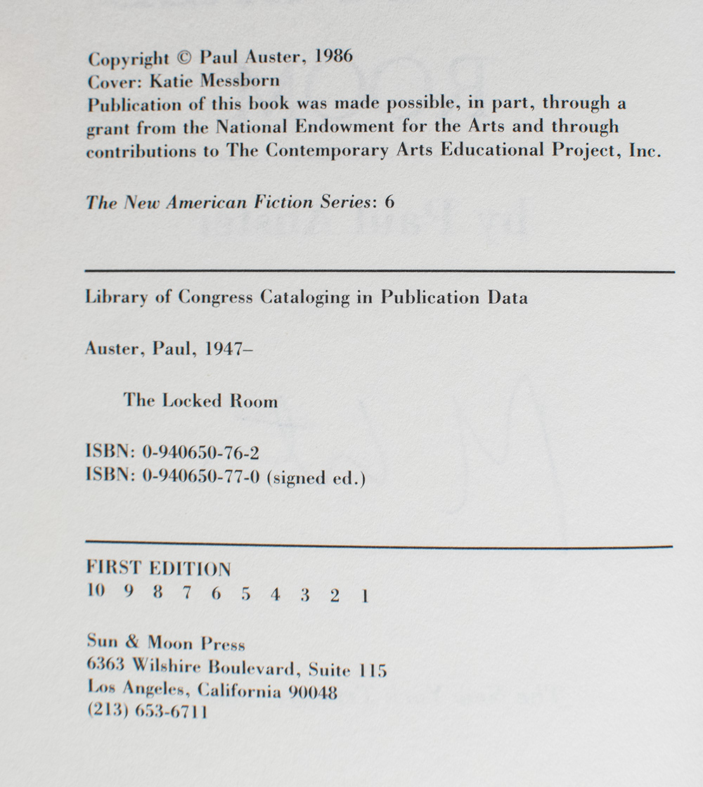 First editions of Auster’s classic detective novels, each signed by him on the title page with a quote from each book. Octavo, 3 volumes, original cloth. City of Glass is signed as follows, "It was a wrong number that started it...Paul Auster. Ghosts is signed by the author on the title page, "And from this moment on, we know nothing. Paul Auster." The Locked Room is signed by the author on the title page, "The truth is far less imple than I would like it to be. Paul Auster. City of Glass in first-state dust jacket, with no publisher’s device at spine foot. Each are fine in a fine dust jackets. An exceptional unique set.