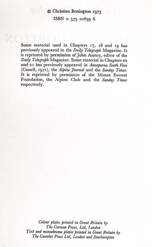 First Edition of Chris Bonington's The Next Horizon; Signed by Him; From the Library of Fellow Adventurer Steve Fossett