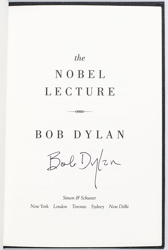 First edition of Dylan's Nobel Lecture. Octavo, original boards. Signed by Bob Dylan on the title page. In fine condition. Rare and desirable signed.