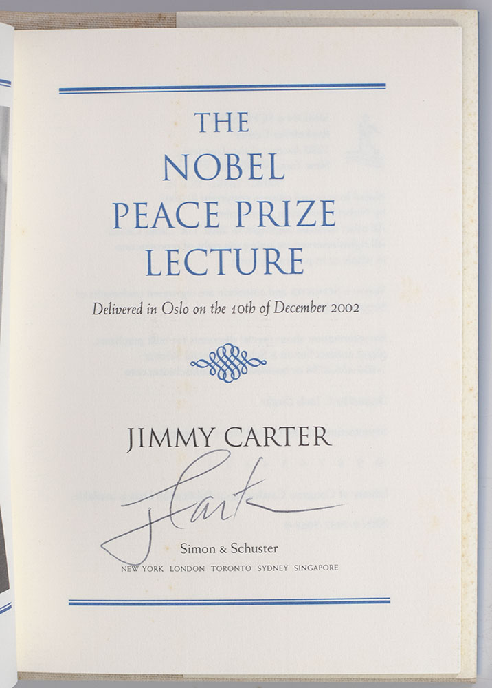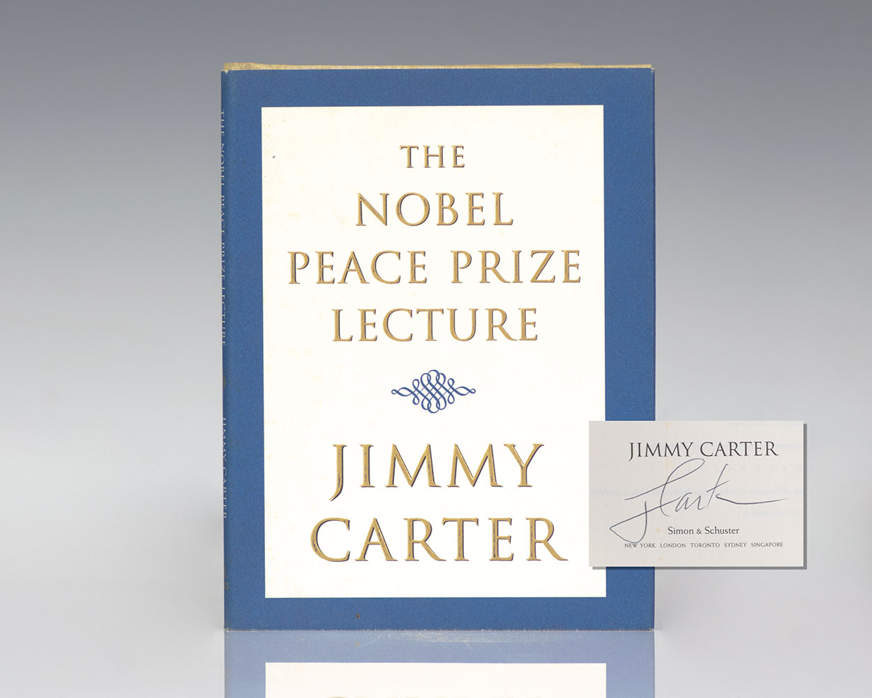First edition of Jimmy Carter's Nobel Peace Prize lecture. Small octavo, original cloth. Boldly signed by Jimmy Carter on the title page. Fine in a fine dust jacket. Jacket design by Michael Accordino.