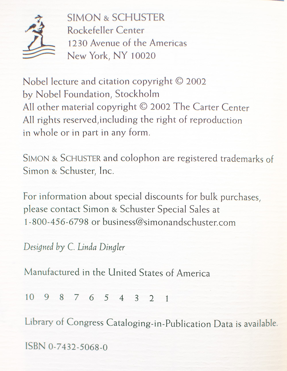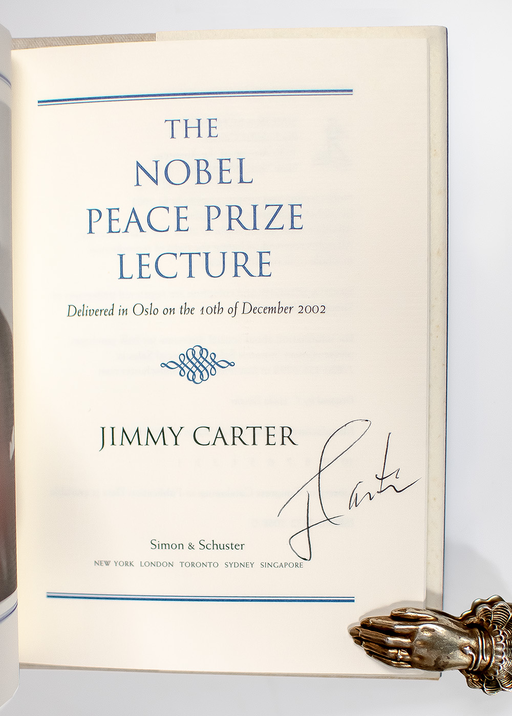 First edition of Jimmy Carter's Nobel Peace Prize lecture. Small octavo, original cloth. Boldly signed by Jimmy Carter on the title page. Fine in a fine dust jacket. Jacket design by Michael Accordino.