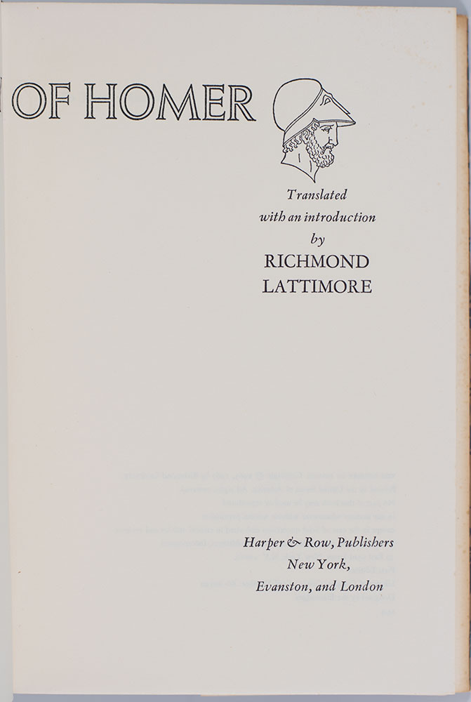 First edition of Lattimore's acclaimed translation called "the finest translation of Homer ever made into the English language" (William Arrowsmith). Octavo, original cloth. Near fine in a near fine dust jacket. Jacket design by Guy Fleming. First editions are uncommon.