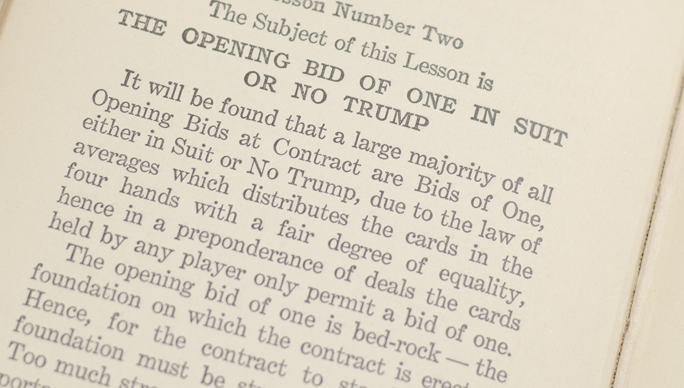 First edition of this official Prohibition era manual to the game of contract bridge; warmly inscribed by Warren Buffett to his long-time bridge partner and close personal friend Sharon Osberg. Octavo, original cloth, inscribed by Buffett on the title page, "To Sharon - This was the nursery book my mother read to me at age 1. Unfortunately she emphasized Chapter 17. Love, Warren." Sharon Osberg is a close friend of both Warren Buffett and Bill Gates, and has coached both on the game of bridge, for which she has won several championships and awards. Chapter 17, which Buffett here refers to, discusses the subject of overbidding and how it can be either a disastrous move or a smart tactic. In very good condition. An exceptional association. From the library of Sharon Osberg.
