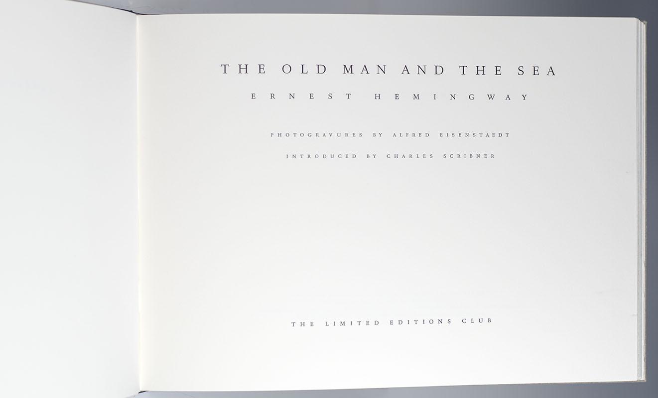 First Limited Editions Club limited edition of Hemingway's Nobel Prize-winning masterpiece, signed by photographer Alfred Eisenstaedt. Oblong quarto, bound in one quarter morocco over cloth-covered boards, illustrated with five photogravures by Alfred Eisenstaedt printed from the original negatives by Eisenstaedt in 1952 for the Life Magazine featuring the iconic image of Hemingway on the cover. One of only 600 copies signed by Alfred Eisenstaedt on the limitation page. In fine condition. Housed in the original black suede-lined cloth clamshell case.