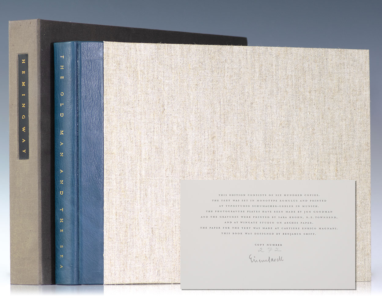 First Limited Editions Club limited edition of Hemingway's Nobel Prize-winning masterpiece, signed by photographer Alfred Eisenstaedt. Oblong quarto, bound in one quarter morocco over cloth-covered boards, illustrated with five photogravures by Alfred Eisenstaedt printed from the original negatives by Eisenstaedt in 1952 for the Life Magazine featuring the iconic image of Hemingway on the cover. One of only 600 copies signed by Alfred Eisenstaedt on the limitation page. In fine condition. Housed in the original black suede-lined cloth clamshell case with The Limited Editions Club newsletter dated June 1990 laid in.