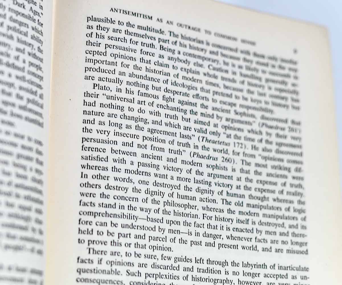 Hannah Arendt is "widely recognized as one of the most original and influential political thinkers of the 20th century." Origins of Totalitarianism, her first book in America, "established Arendt's reputation as a political thinker and has a good claim to be regarded as the key to her work" (Cambridge Companion, 1, 25). In this volume, "her acknowledged masterwork… she not only offered a uniquely clear-sighted, broad account of twentieth-century totalitarian politics and their antecedents, she also provided… a landmark contribution to the discourse of international human rights" (Benhabib, Politics in Dark Times, 83, 1). Consisting of three sections, Antisemitism, Imperialism and Totalitarianism, Origins "was written, simply, to begin what Arendt called 'the interminable dialogue' with a new and horrific form of politics… It was in this book that Arendt began to grapple with the problem of political evil—evil as policy—on an enormous and hitherto unimaginable scale" (Cambridge Companion, 2). Le Monde placed the book among the 100 best books of any kind of the 20th century, while the National Review ranked it #15 on its list of the 100 best non-fiction books of the century. The Intercollegiate Studies Institute listed it among the 50 best non-fiction books of the century.