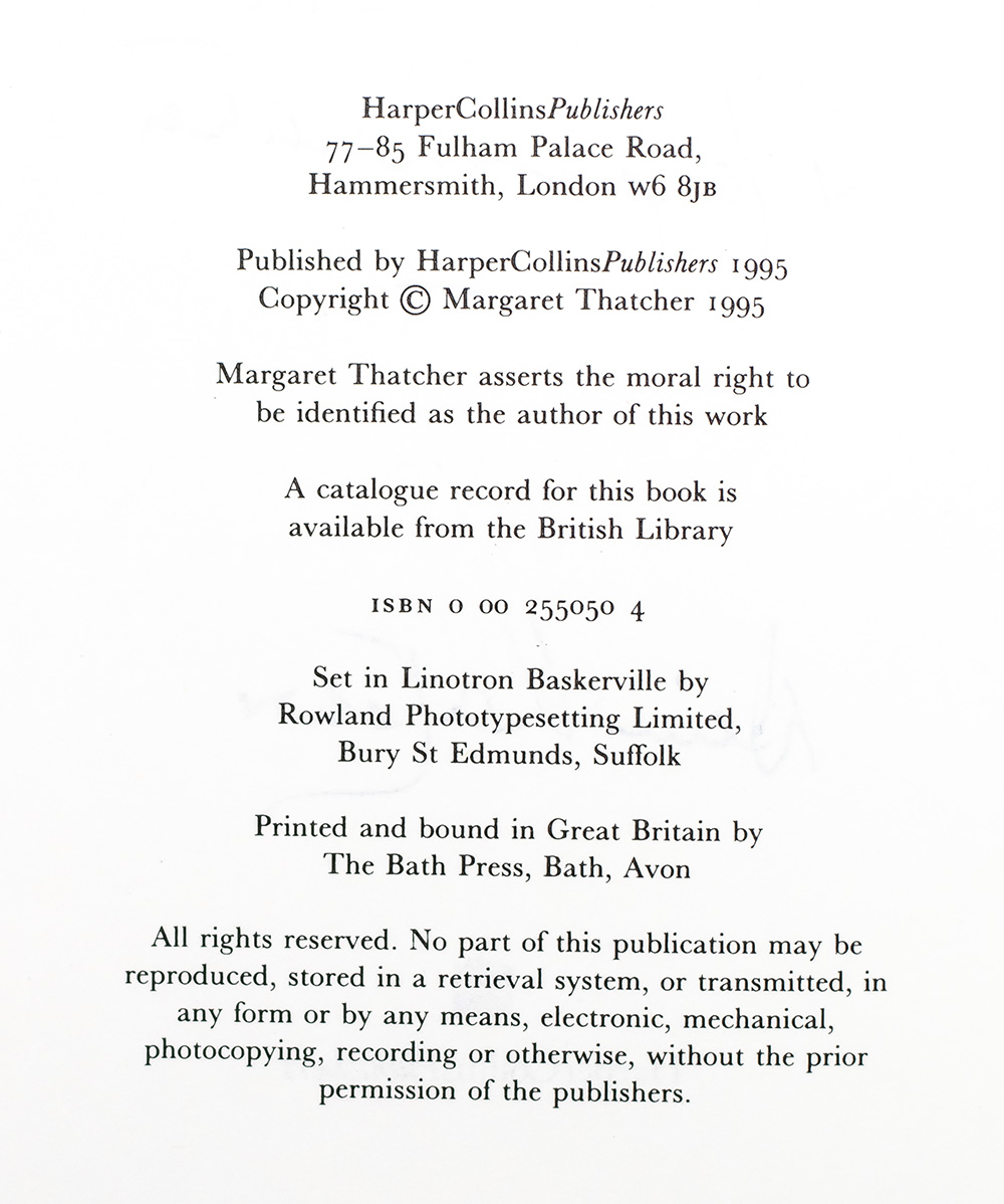 First edition of Thatcher's best-selling memoir, covering her life from her birth in 1925 until she became Prime Minister in 1979. Octavo, original cloth, illustrated. Presentation copy, inscribed by Margaret Thatcher on the title page, "To Andrew, all good wishes Margaret Thatcher." Additionally inscribed by Margaret Thatcher's husband, Sir Denis Thatcher, on the half-title page, "Dear Andrew The signed book sent to you with best wishes from us both Yours sincerely Denis Thatcher" and signed by Sir Denis again on the title page. Fine in a fine dust jacket. A very fine and unique example.