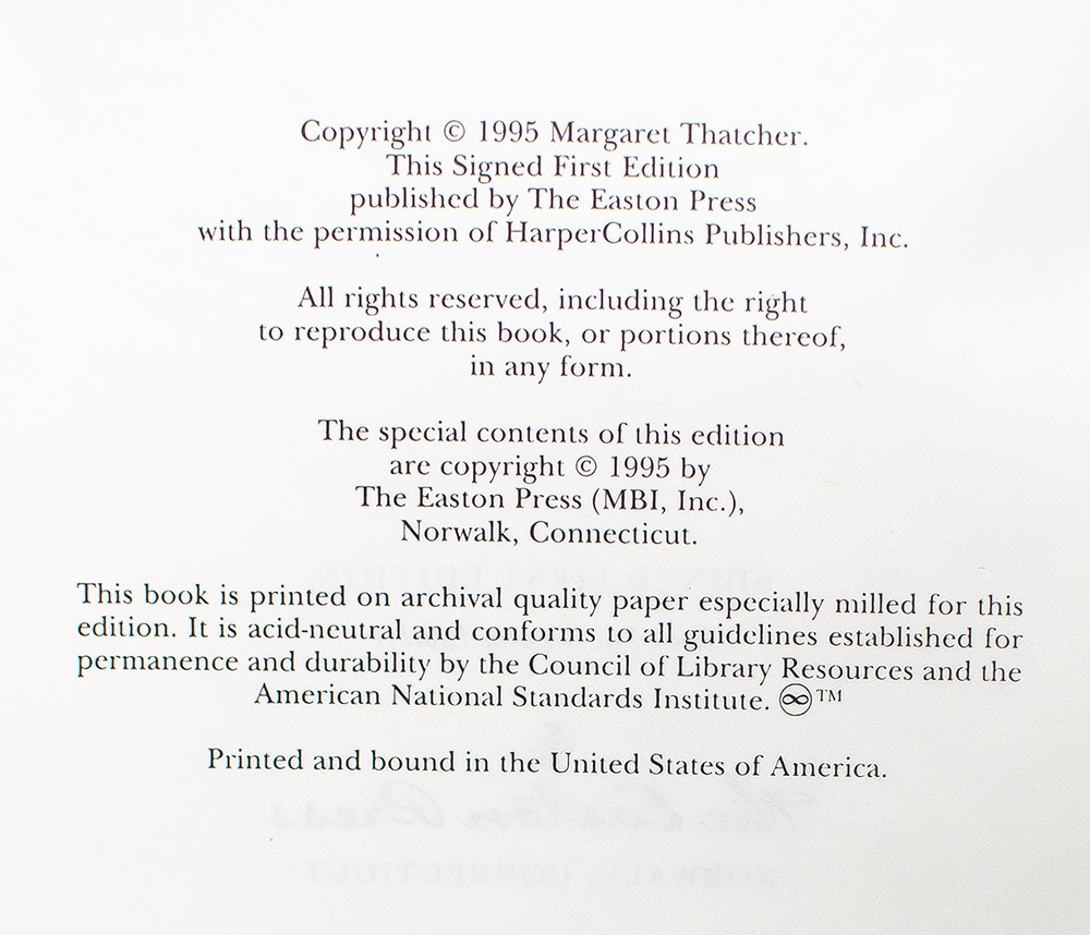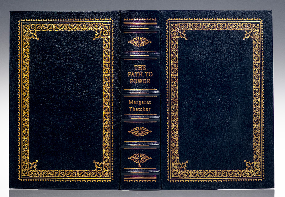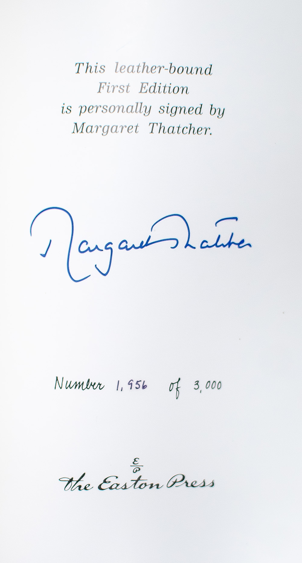 Signed limited edition of Thatcher's autobiography. Octavo, publisher's original full leather with gilt titles and raised bands to the spine, front and rear panels, all edges gilt, ribbon bound in, illustrated with photographs. Boldly signed by Margaret Thatcher. In fine condition.