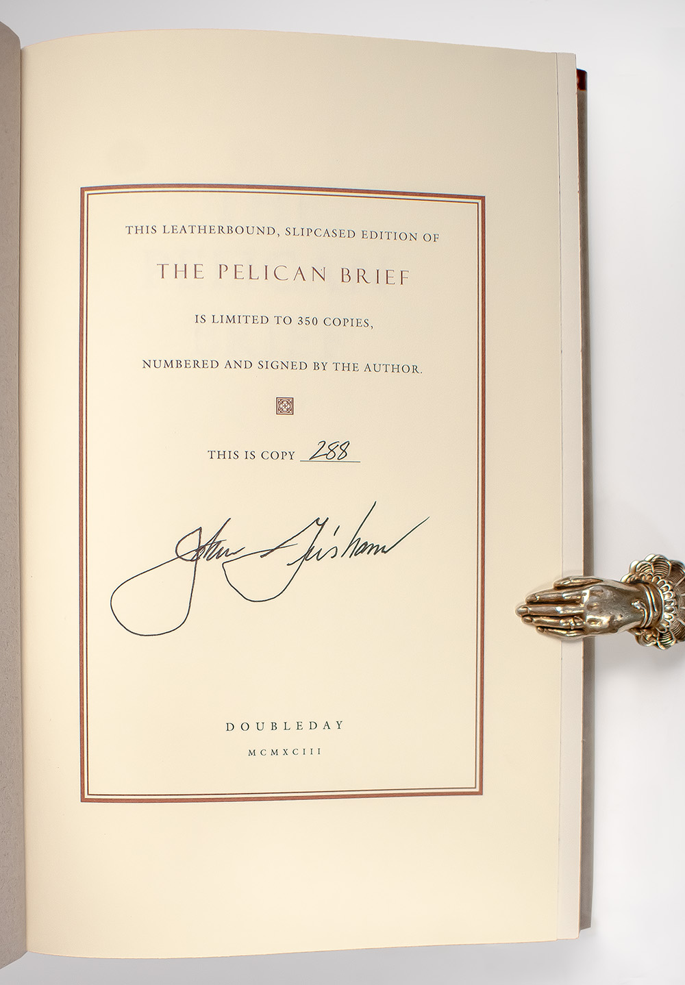 Signed limited edition of Grisham's third novel, the basis for the 1993 film adaptation starring Julia Roberts and Denzel Washington. Octavo, original publisher's full leather gilt, marbled endpapers, ribbon bound in. This leatherbound, slipcased edition limited to 350 copies, numbered and signed by the author on the limitation page, this is copy number 288. In fine condition. Housed in the original publishers glassine which is in fine condition and the original publisher's slipcase. A superior example.