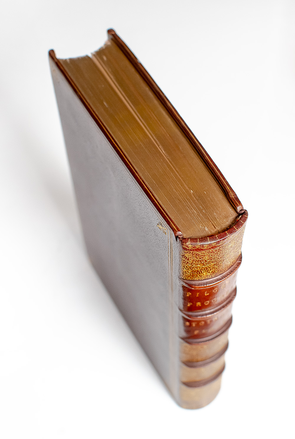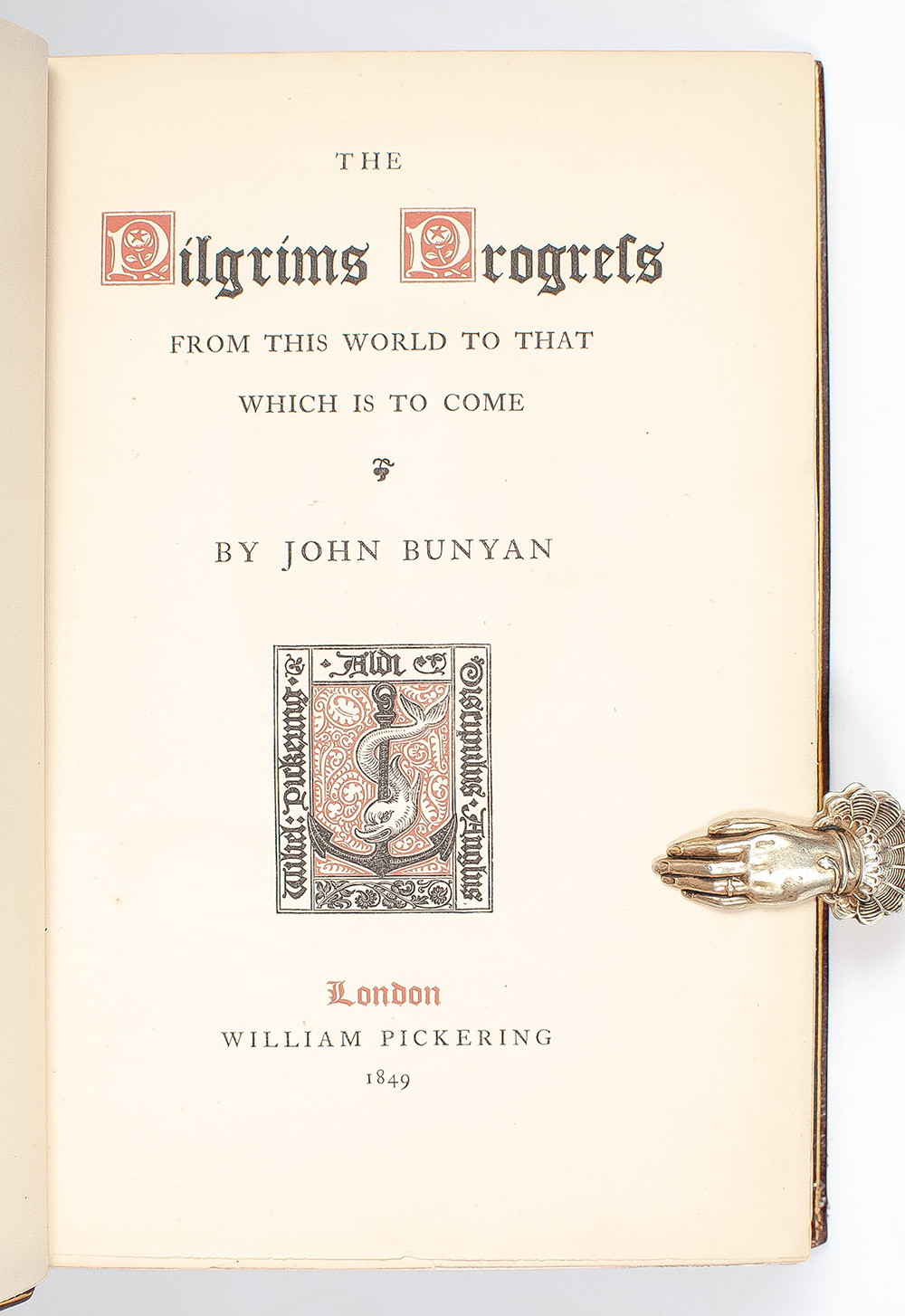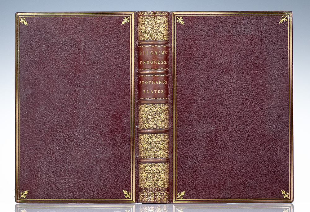 Rare large print Pickering edition of one of the most significant works of religious English literature. Octavo, bound in full crushed morocco by Tout Bindery with gilt titles and intricate tooling to the spine in six compartments within raised gilt bands, gilt ruled borders to the front and rear panels, gilt turn-ins and inner dentelles, top edge gilt, original red silk ribbon laid in, marbled endpapers, tissue-guarded engraved frontispiece portrait of John Bunyan, illustrated with tissue-guarded engraved plates, headpiece and initial. In near fine condition with very light rubbing to the extremities and a bookplate to the front pastedown.