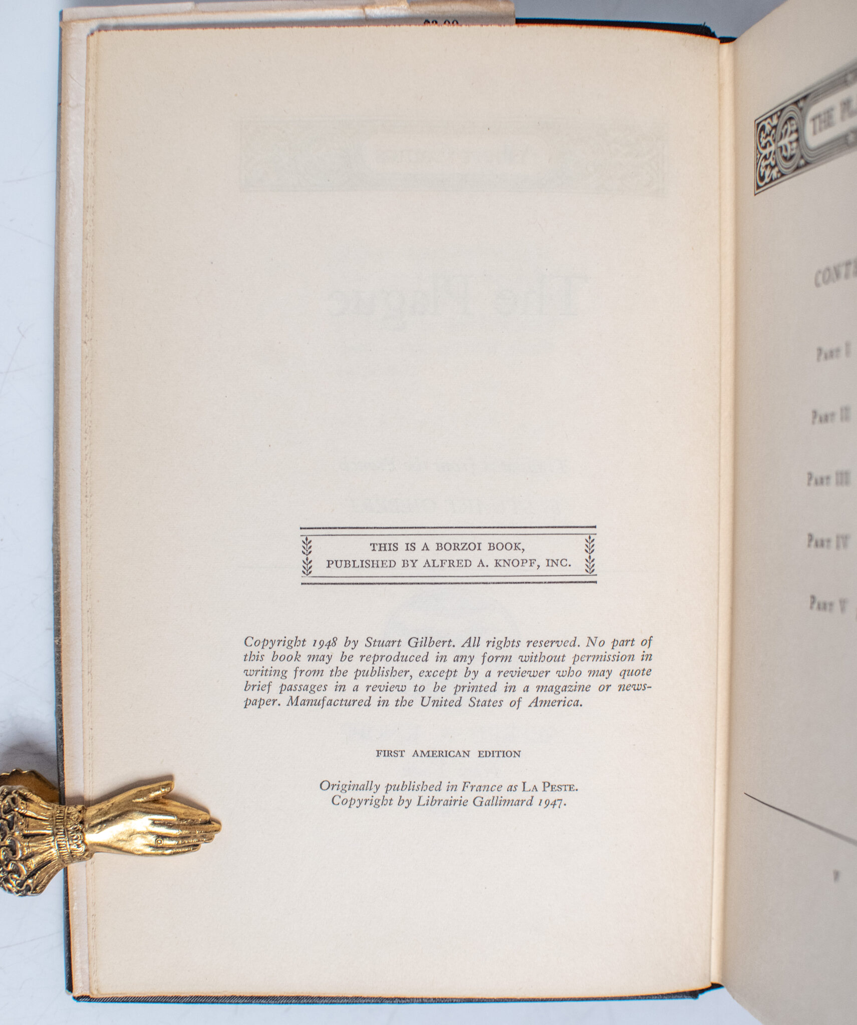 First edition in English of Camus' work, which tells the story of a plague sweeping the French Algerian city of Oran. Octavo, original cloth. Fine in a near fine dust jacket. Translated from the French by Stuart Gilbert. Jacket design by Michael Ayrton. One of the nicest examples we have seen.