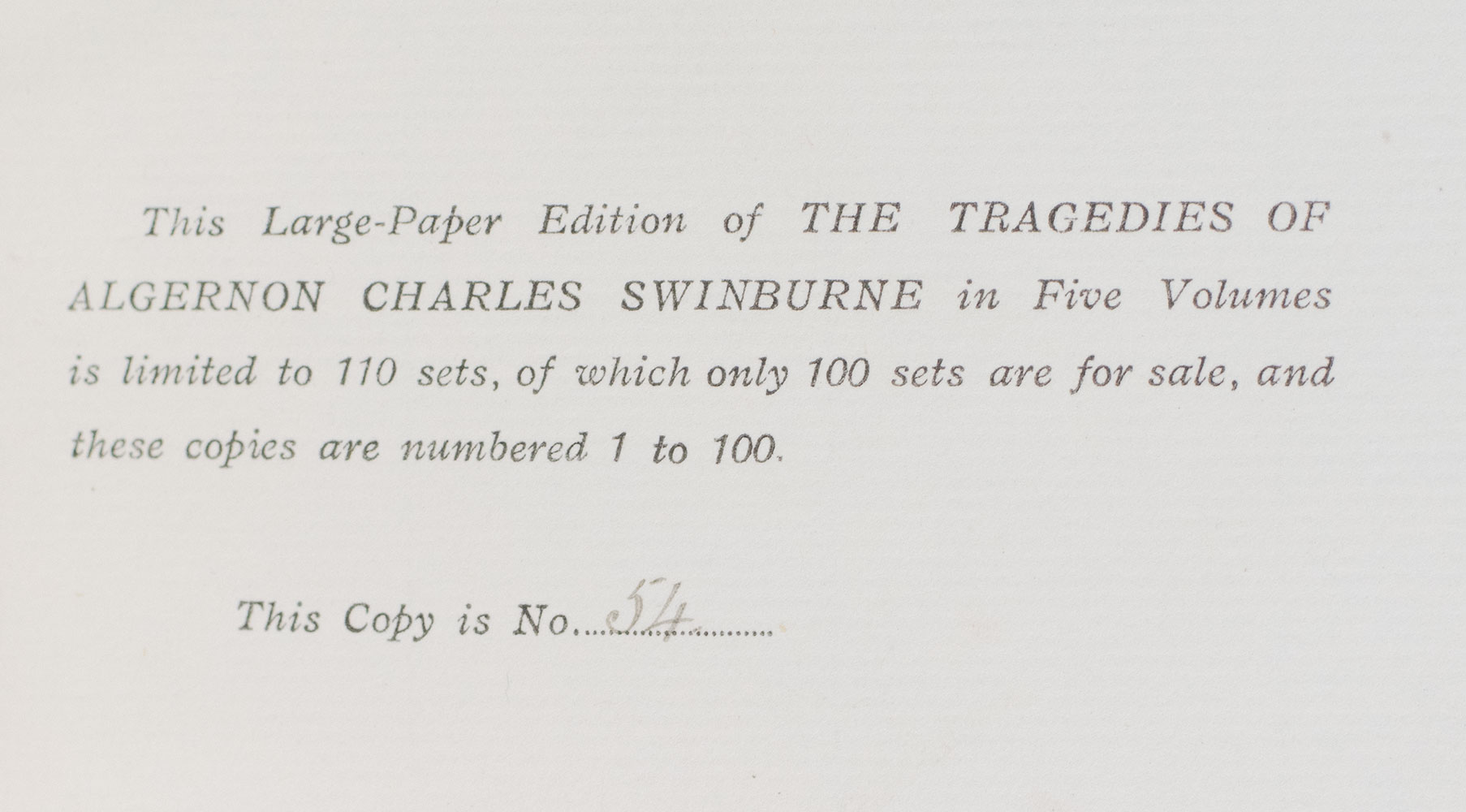 The Large-Paper edition of the poems and tragedies of Algernon Charles Swinburne. Octavo, 11 volumes, bound in three quarter crushed levant morocco, gilt titles and ruling to the spine in six compartments within raised gilt bands, marbled endpapers, top edge gilt with others untrimmed, ribbons bound in. One of 110 numbered sets, this is number 54. In near fine condition.