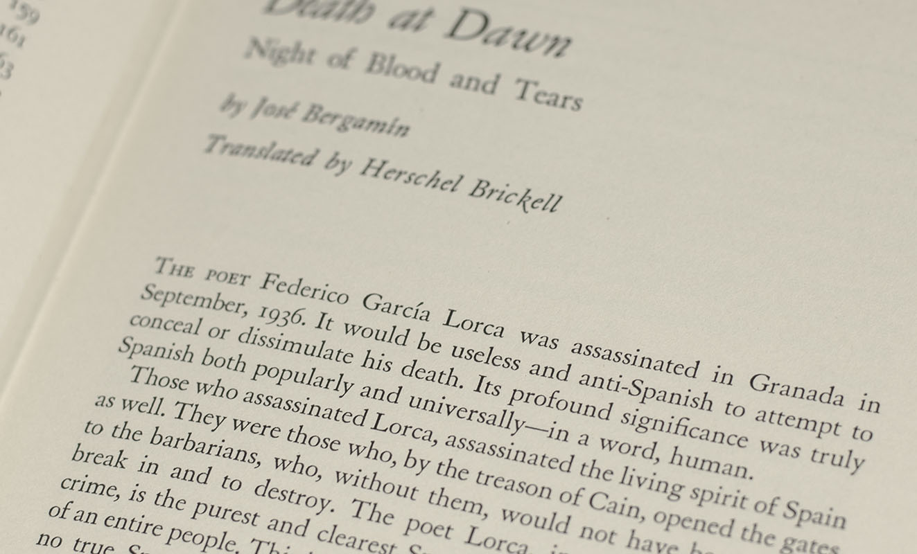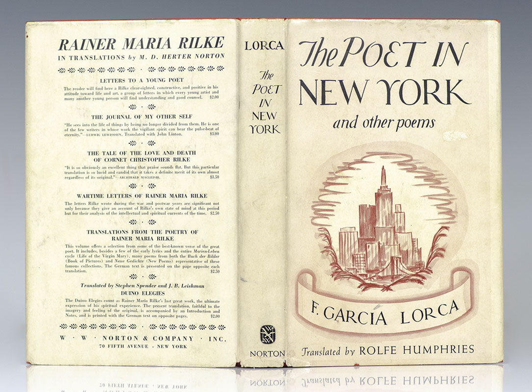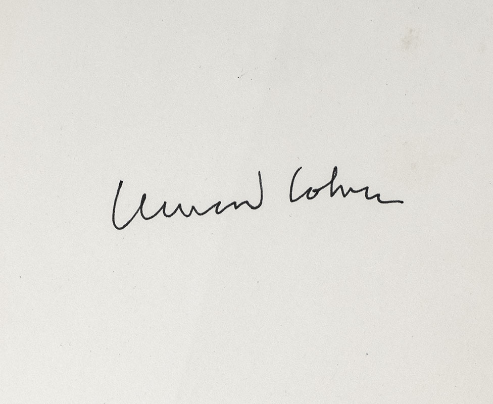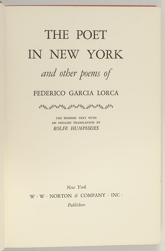 First edition of Lorca’s masterpiece. Octavo, original cloth. Signed by fellow poet Leonard Cohen on the front free endpaper. Cohen was deeply influenced by the work of Lorca for the duration of his poetic and musical career. "Now, you know of my deep association and confraternity with the poet Federico Garcia Lorca. I could say that when I was a young man, an adolescent, and I hungered for a voice, I studied the English poets and I knew their work well, and I copied their styles, but I could not find a voice. It was only when I read, even in translation, the works of Lorca that I understood that there was a voice. It is not that I copied his voice; I would not dare. But he gave me permission to find a voice, to locate a voice, that is to locate a self, a self that is not fixed, a self that struggles for its own existence. As I grew older, I understood that instructions came with this voice. What were these instructions? The instructions were never to lament casually. And if one is to express the great inevitable defeat that awaits us all, it must be done within the strict confines of dignity and beauty" (Leonard Cohen). Near fine in a near fine dust jacket. Translated by Rolfe Humphries. Housed in a custom half morocco clamshell box made by the Harcourt Bindery. A unique example, most rare and desirable signed by Cohen.