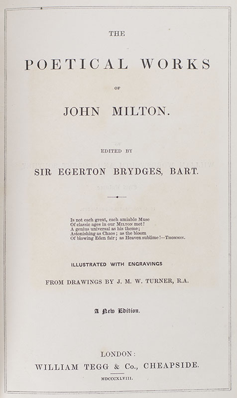 Finely bound 19th century printing of Milton's poetical works finely bound with a split erotic fore-edge painting. Octavo, bound in full morocco with gilt titles and tooling to the spine in five compartments within raised gilt bands, double gilt ruling and tooling to the front and rear panels, gilt turn-ins and inner dentelles, all edges gilt with a split erotic fore-edge painting after Thomas Rowlandson, patterned endpapers, illustrated with engravings from drawings by J. M. W. Turner. In near fine condition. Ownership inscription.