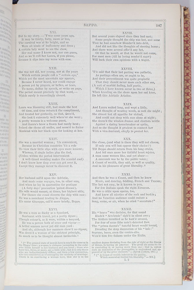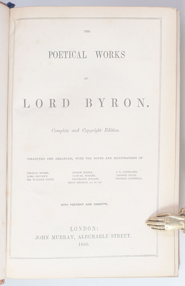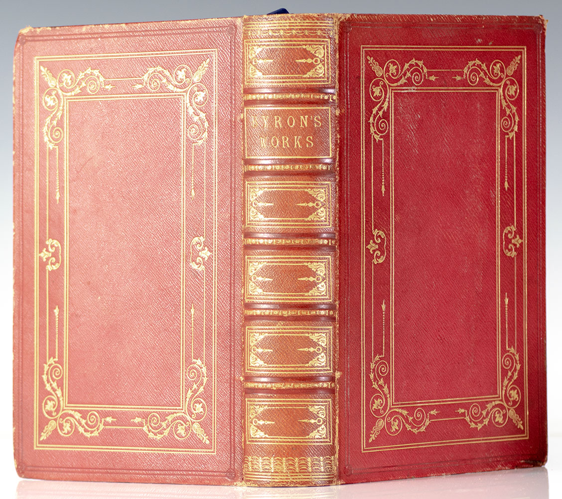 Finely bound edition of the complete poetical works of Lord Byron. Octavo, bound in full crushed red morocco with gilt titles and tooling to the spine, quadruple gilt ruling and fleuron cornerpieces to the front and rear panels, gilt turn-in and inner dentelles, patterned endpapers, illustrated, frontispiece portrait of Byron. Decorated with a fore-edge painting depicting a portrait of Byron and a landscape. In very good condition.