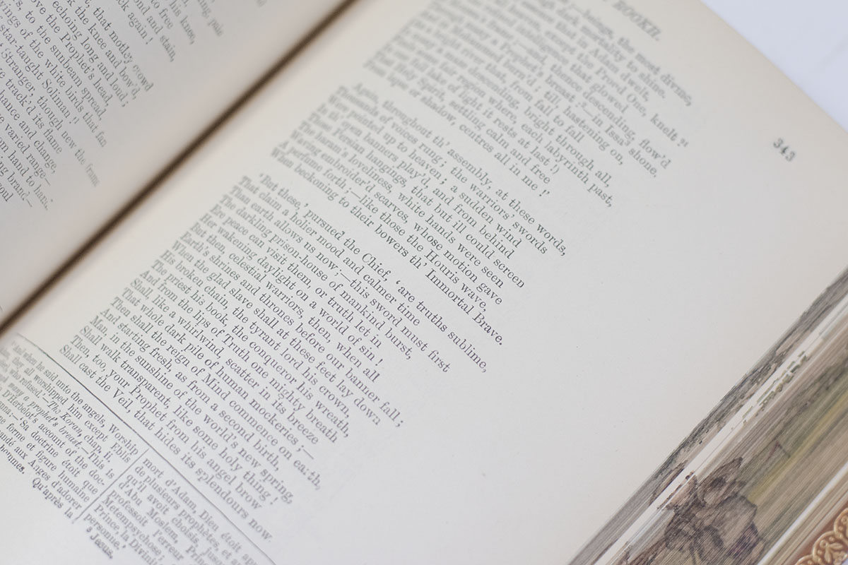 The Albion edition of Moore's poetical works. Octavo, bound in full polished tree calf with elaborate gilt tooling to the spine in six compartments within raised gilt bands, morocco spine label lettered in gilt, gilt ruling to the front and rear panels, gilt turn-ins and inner dentelles, marbled endpapers, all edges gilt, tissue-guarded engraved frontispiece portrait of Moore. With a double concealed fore-edge painting revealing two golfing scenes. In very good condition.