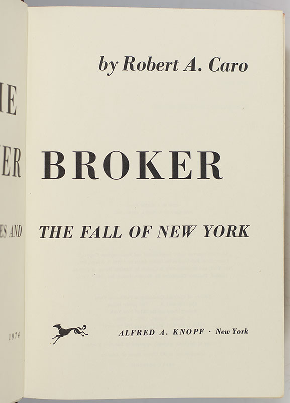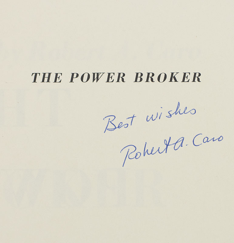 First edition of the author's Pulitzer-Prize winning work on Robert Moses. Thick octavo, original black cloth, cartographic endpapers. Signed by the author on the half-title page, "Best wishes Robert A. Caro." Near fine in a very good dust jacket with a few closed tears. Jacket design by Paul Bacon. A very nice example of this bulky book, which tends to show wear.