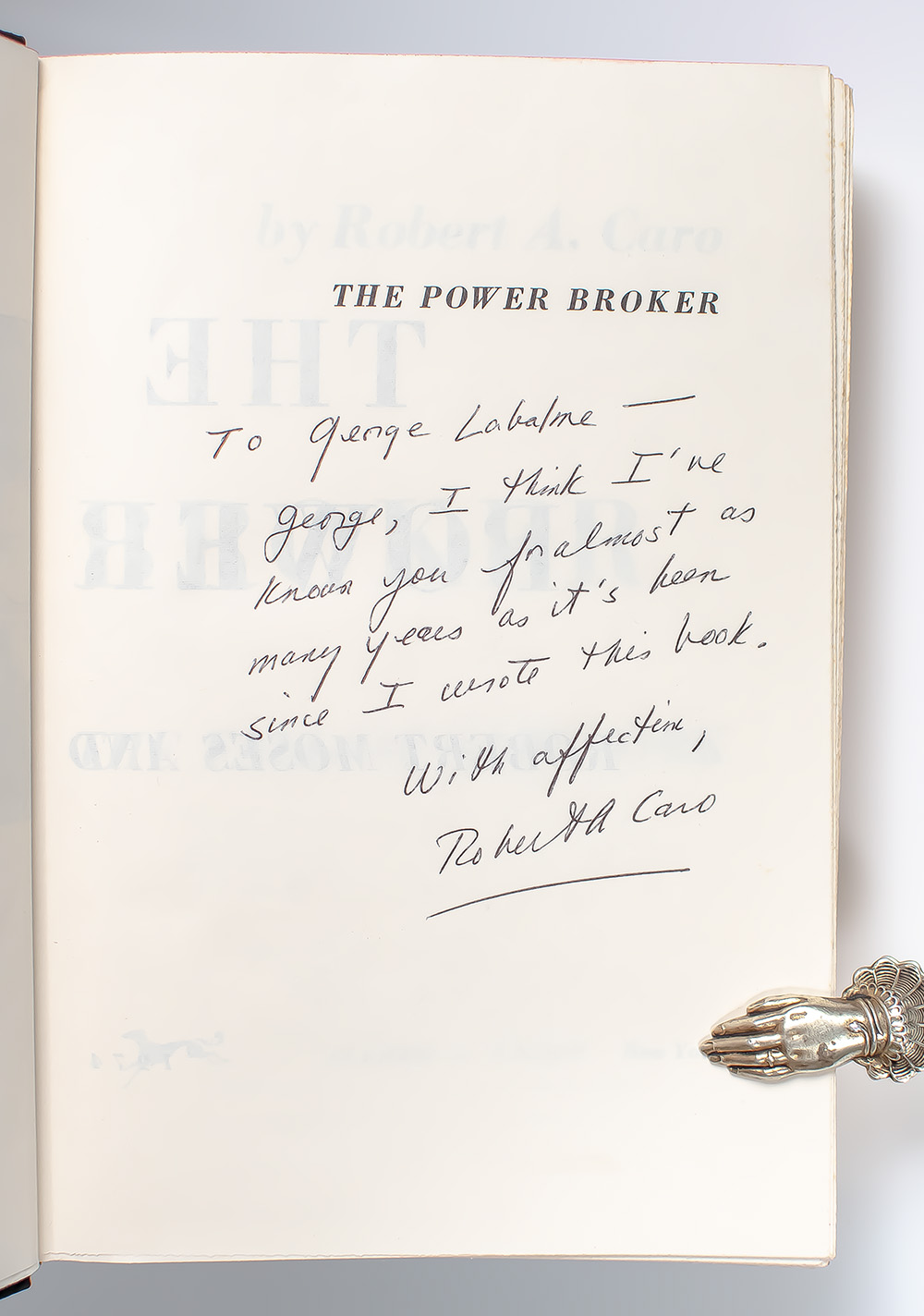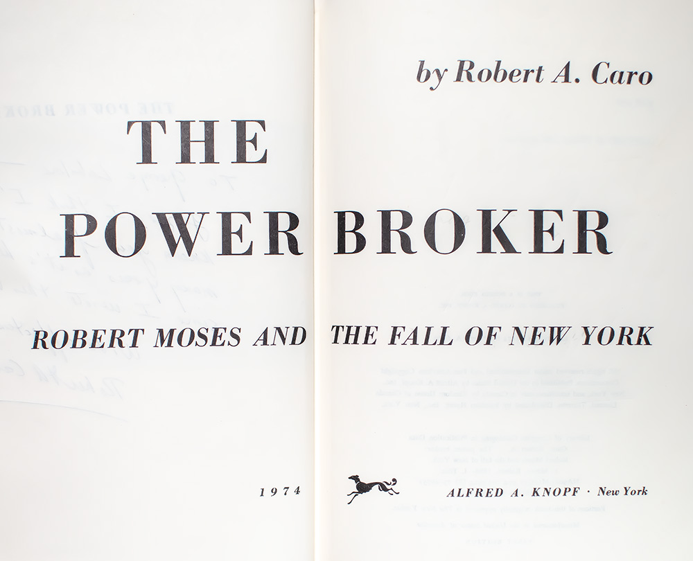 "In the twentieth century, the influence of Robert Moses on the cities of America was greater than that of any other person": First Edition of The Power Broker; Inscribed By Robert A. Caro to mentor and Vice President of the New York Public Library George Labalme Jr.
