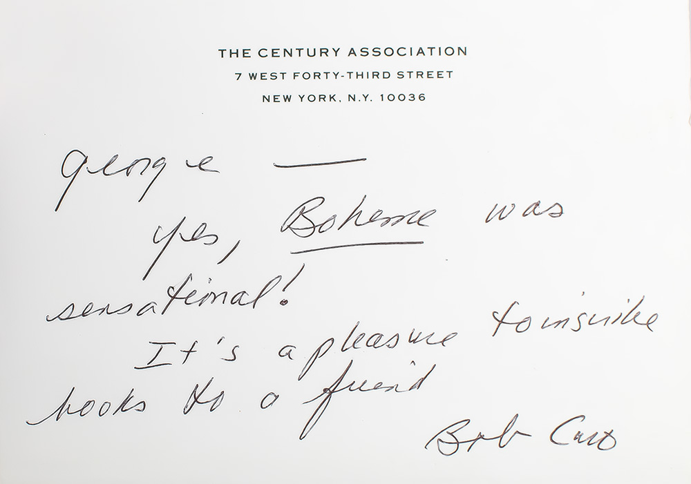 First edition of Caro's Pulitzer-Prize winning work on Robert Moses. Thick octavo, original black cloth, cartographic endpapers, illustrated with numerous photographs and maps, top edge red. Association copy, inscribed by the author on the half-title page, "To George Labalme - George, I think I've known you for almost as many years as its been since I wrote this book. With affection, Robert A. Caro." The recipient, philanthropist and designer, George Labalme Jr. (1927–2016) served as Vice President of the New York Public Library for nine years and was heavily involved with several other cultural and philanthropic organizations, including the Jacob and Valeria Langeloth Foundation and the Renaissance Society of America. His professional design work included collaborations with Gio Ponti and Raymond Loewy, and he notably designed the Grey Poupon mustard jar. Labalme and Caro first connected in the vibrant New York intellectual and cultural scene during the 1950s or early 1960s, a period when Caro was beginning his career as a journalist and writer. Labalme, already well-established as a designer and active in philanthropic and literary circles, took an interest in Caro’s work and potential. Recognizing Caro’s talent and ambition, Labalme offered both personal encouragement and practical support, helping Caro navigate the challenges of early career development, including access to networks and resources in the publishing world. Their friendship was built on mutual respect and shared commitment to the arts and ideas, and Labalme’s mentorship provided Caro with valuable guidance during crucial stages of his writing career. This support was instrumental in Caro’s perseverance as he embarked on his extensive research projects, including his landmark biographies of Robert Moses and Lyndon Johnson. Labalme and Caro both served as trustees of the New York Society Library, Labalme in 1988, and Caro in 1994. With the original transmittal note inscribed by Caro to Labalme laid in on Caro's Century Association letterhead, "George - Yes, Boheme was sensational! It's a pleasure to inscribe books to a friend. Bob Caro." Near fine in a very good price-clipped dust jacket. Jacket design by Paul Bacon. An very nice example of this monumental work with fine provenance.
