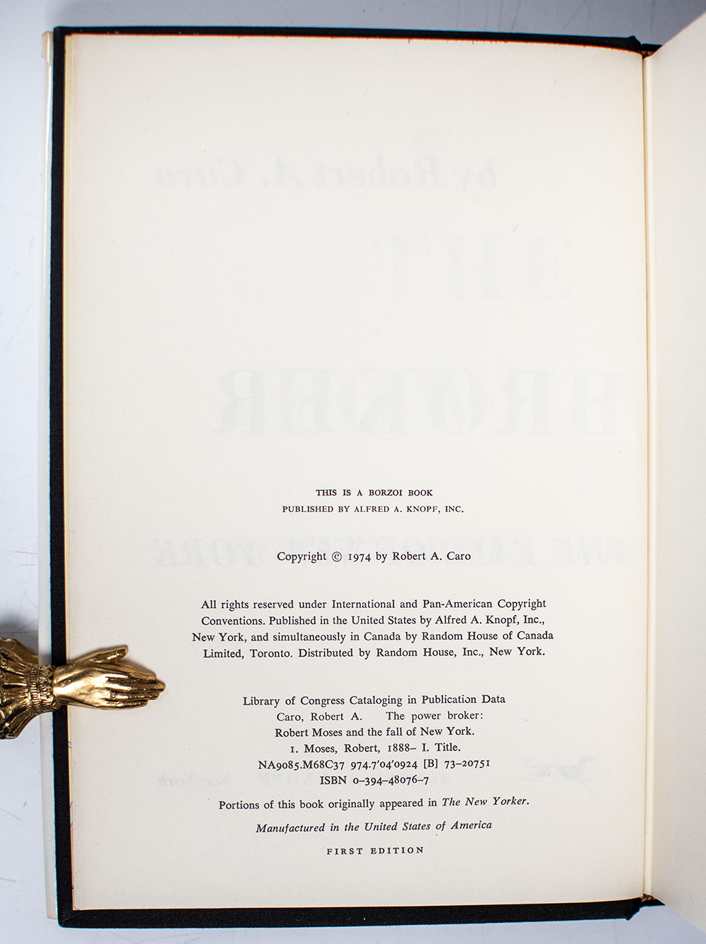 First edition of Caro's Pulitzer-Prize winning work on Robert Moses. Thick octavo, original black cloth, cartographic endpapers, illustrated with numerous photographs and maps, top stain red. Association copy, inscribed by the author on the half-title page, "For Paul Schrader - with best wishes Robert A Caro." The recipient, Paul Schrader, is a screenwriter, director, and critic, has built a body of work defined by his preoccupation with moral crisis, alienation, and the psychological burdens of modernity. Drawing from his Calvinist upbringing and influenced by existential and transcendental philosophy, Schrader’s cinema often examines individuals estranged from society yet driven by an austere inner logic—figures such as Travis Bickle in Taxi Driver (1976), Julian Kaye in American Gigolo (1980), and Reverend Ernst Toller in First Reformed (2017). These characters, shaped by guilt, repression, and obsession, embody Schrader’s recurring interest in the intersection of faith, violence, and the search for redemption. His stylistic restraint and focus on interior states reveal a fascination with the cost of moral conviction in a secular world, where the pursuit of order and purity often collapses into self-destruction. This fascination with the nature and consequences of control finds a compelling parallel in Robert Caro’s The Power Broker (1974), a monumental study of New York urban planner Robert Moses and his accumulation of political authority. Like Schrader’s protagonists, Moses emerges as a man consumed by his own vision of order—one that transforms civic idealism into domination through bureaucratic and infrastructural power. Caro’s analysis of how moral purpose becomes corrupted by the mechanisms of influence resonates with Schrader’s cinematic meditation on obsession and isolation: both artists explore how the will to impose structure on chaos—whether through architecture, policy, or personal discipline—can erode empathy and moral clarity. The Power Broker and Schrader’s films share a thematic concern with the paradox of power as both a creative and destructive force, revealing how ambition, when untampered by humility, leads not to transcendence but to alienation and decay. Near fine in a near fine price-clipped dust jacket. Jacket design by Paul Bacon. From the collection of Paul Schrader. An exceptional associaton.