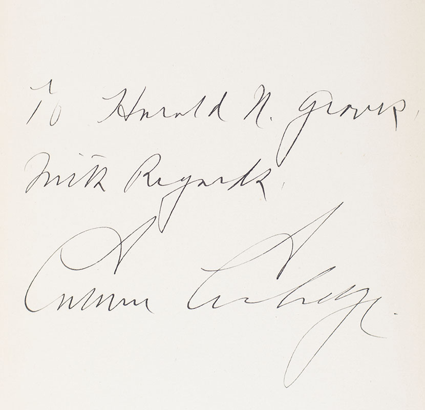 First edition of this collection of speeches from the 30th President of the United States. Octavo, bound in three quarters leather by McDonald Bindery, gilt titles to the spine, raised bands, gilt ruled to the front and rear panels. Presentation copy, inscribed by the author, "To Harold N. Grover With Regards Calvin Coolidge." In very good condition. Uncommon signed and inscribed.