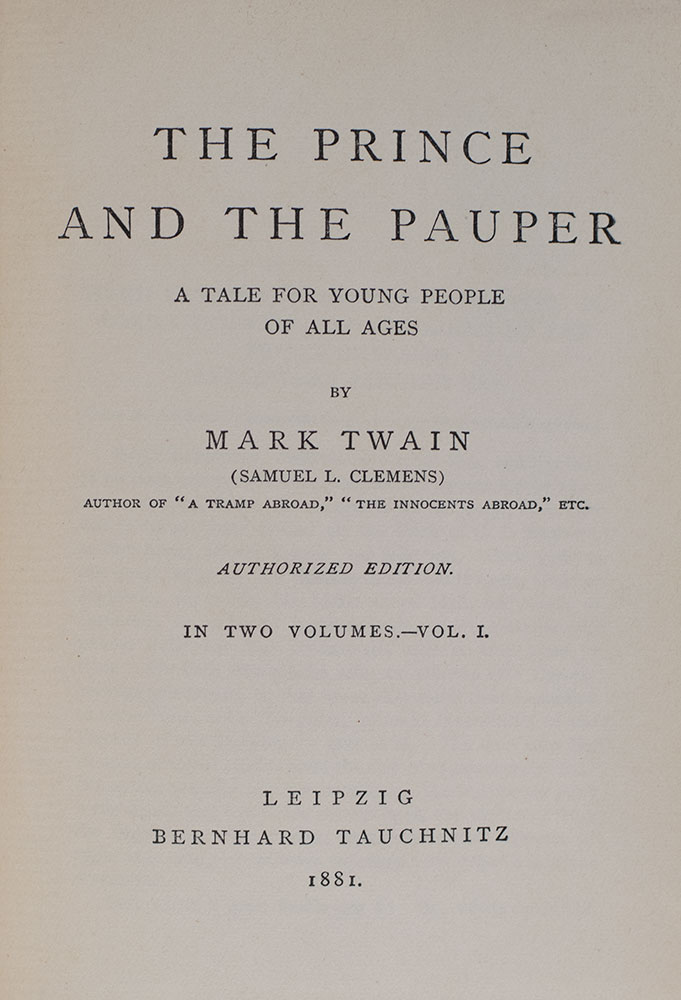 First Tauchnitz edition of Twain’s first attempt at historical fiction, first published in Canada in 1881. 12mo, 2 volumes bound into one in half cloth over marbled boards. From the library of American journalist William Safire with his bookplate to the pastedown. William Safire was an important American author, columnist, journalist, and presidential speechwriter. He joined Nixon’s campaign for the 1960 Presidential race, and again in 1968. After Nixon’s 1968 victory, Safire served as a speechwriter for him and Spiro Agnew. He authored several political columns in addition to his weekly column “On Language” in The New York Times Magazine from 1979 until the month of his death and authored two books on grammar and linguistics: The New Language of Politics (1968) and what Zimmer called Safire’s “magnum opus,” Safire’s Political Dictionary. Safire later served as a member of the Pulitzer Prize Board from 1995 to 2004 and in 2006 was awarded the Presidential Medal of Freedom by President George W. Bush. In good condition.