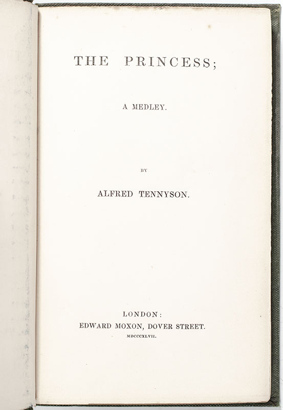 First edition of Tennyson's serio-comedic narrative poem about the heroic Princess Ida. Octavo, original cloth with gilt titles to the spine and ruling to the panels stamped in blind. In near fine condition. Housed in a custom clamshell box.