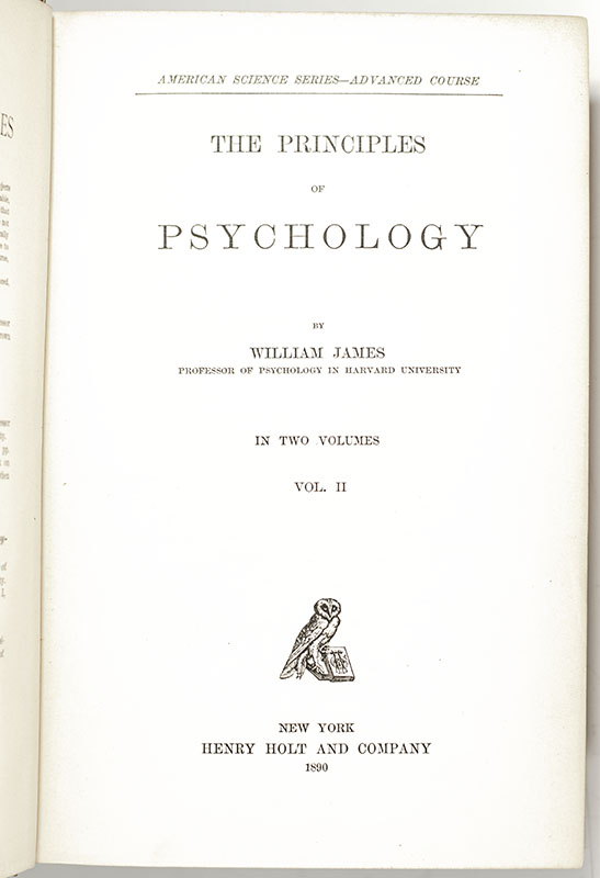 First edition, first printing of James' vastly influential textbook on psychology. Octavo, two volumes, original cloth with gilt titles to the spines, illustrated with numerous tables and diagrams, 8 pages of advertisements. First state with the hyphenated 'Psy-chology'  in the advertisement opposite the title page of vol. I and misprints on page 10 of vol. I and page 101 of vol. II. Tipped in to the front pastedown of vol. I is an autograph note signed and entirely in the hand or James on his Irving Street letterhead which reads, "Dec. 16, '90 My dear Croswell, I thought I had answered your letter of the other day, but found to my surprise the empty envelope in my envelope reservoir - what you say does equal credit to your head and heart and proves to be an honour to American Criticism! Seriously speaking, you warm my heart, for it is only by such responses that a fellow gets the feeling that his book has any reality. They haven't begun to come in in any number yet nor will they I fear, although the friends to whom I have sent the vols. call them noble...Good luck to you and & yours! W.J." With the recipient's bookplates to the pastedowns of each volume. In very good condition with light rubbing to the crown and foot of the spines, some annotations throughout. Rare and desirable, offering an intimate glimpse into the author's thoughts on the initial reception of what would become a seminal work in the history of modern thought. A superior example of this notoriously fragile set.