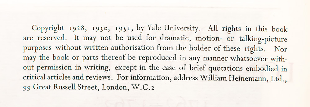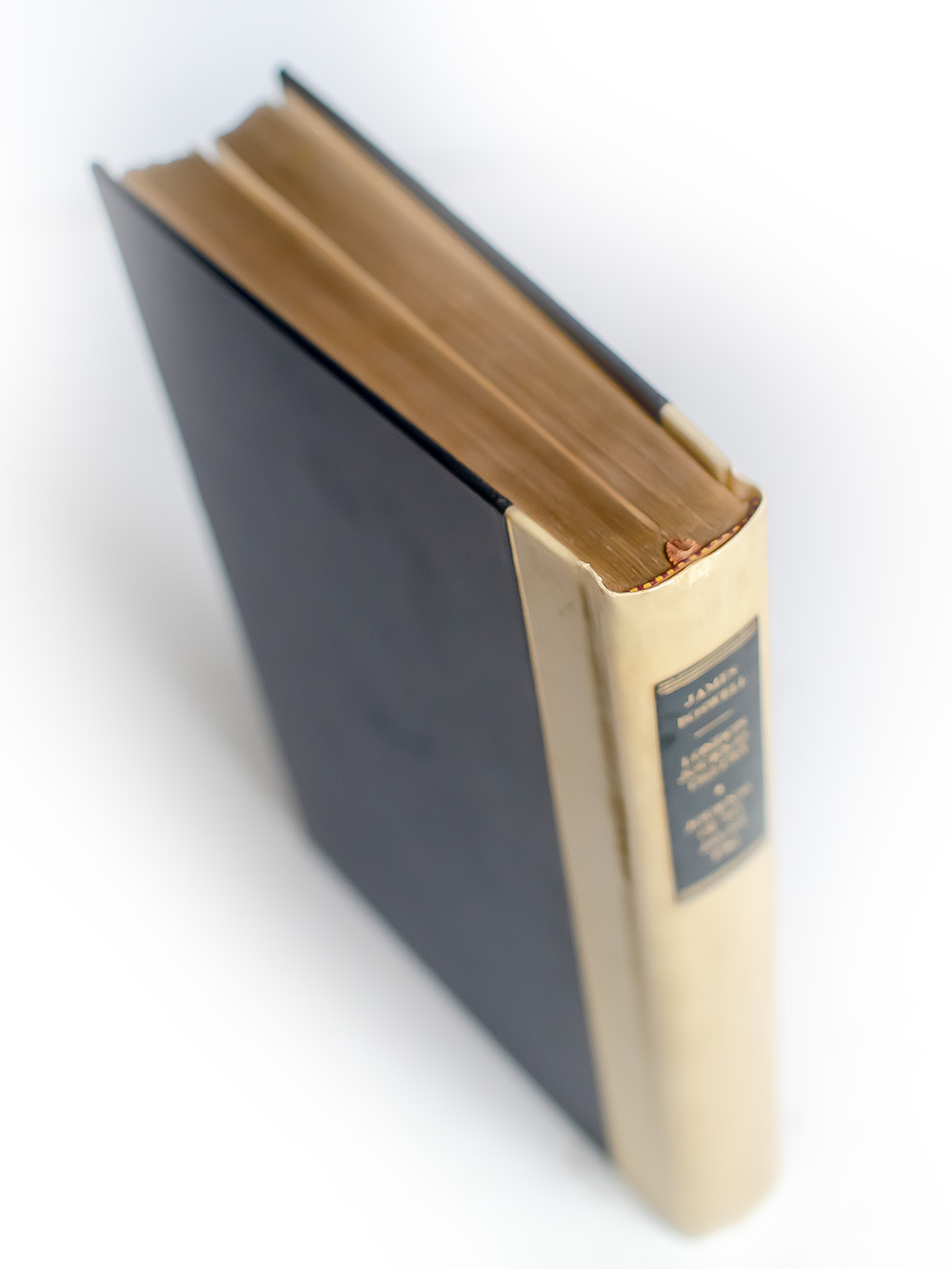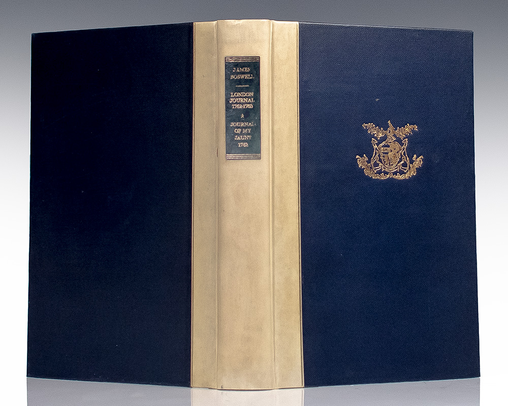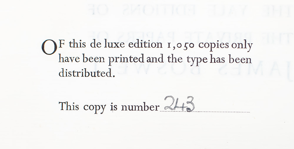 The De Luxe Yale edition of the private papers of James Boswell. Tall octavo, 6 volumes, original publisher's half vellum with morocco spine labels lettered in gilt, gilt coat of arms to each front panel, top edge gilt, ribbons bound in, frontispiece to each volume, illustrated, folding maps. In fine condition. A very attractive set.
