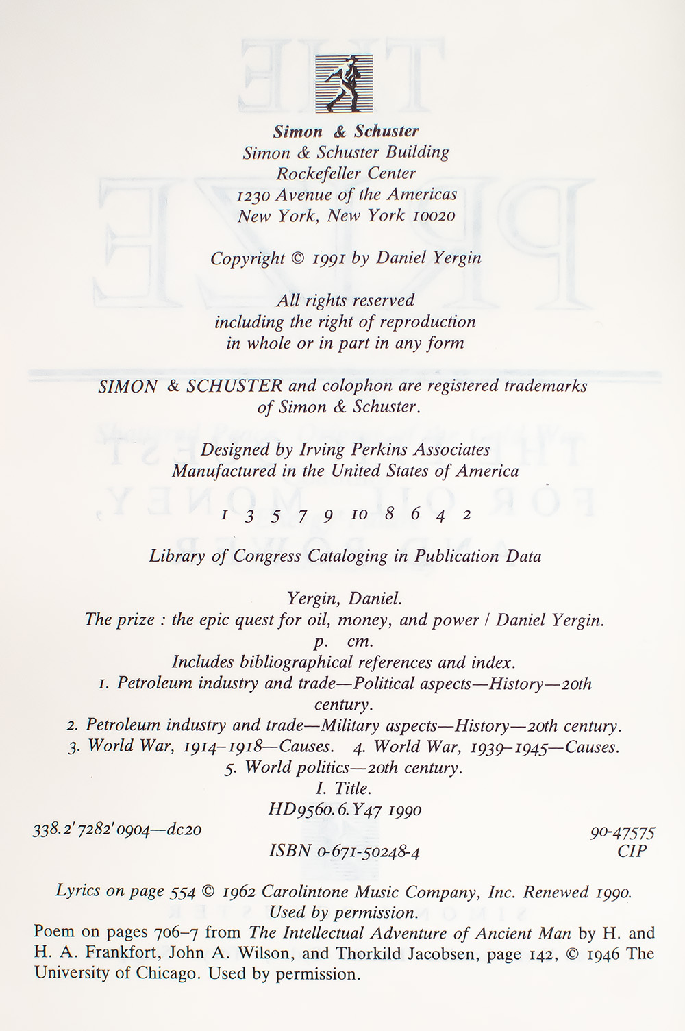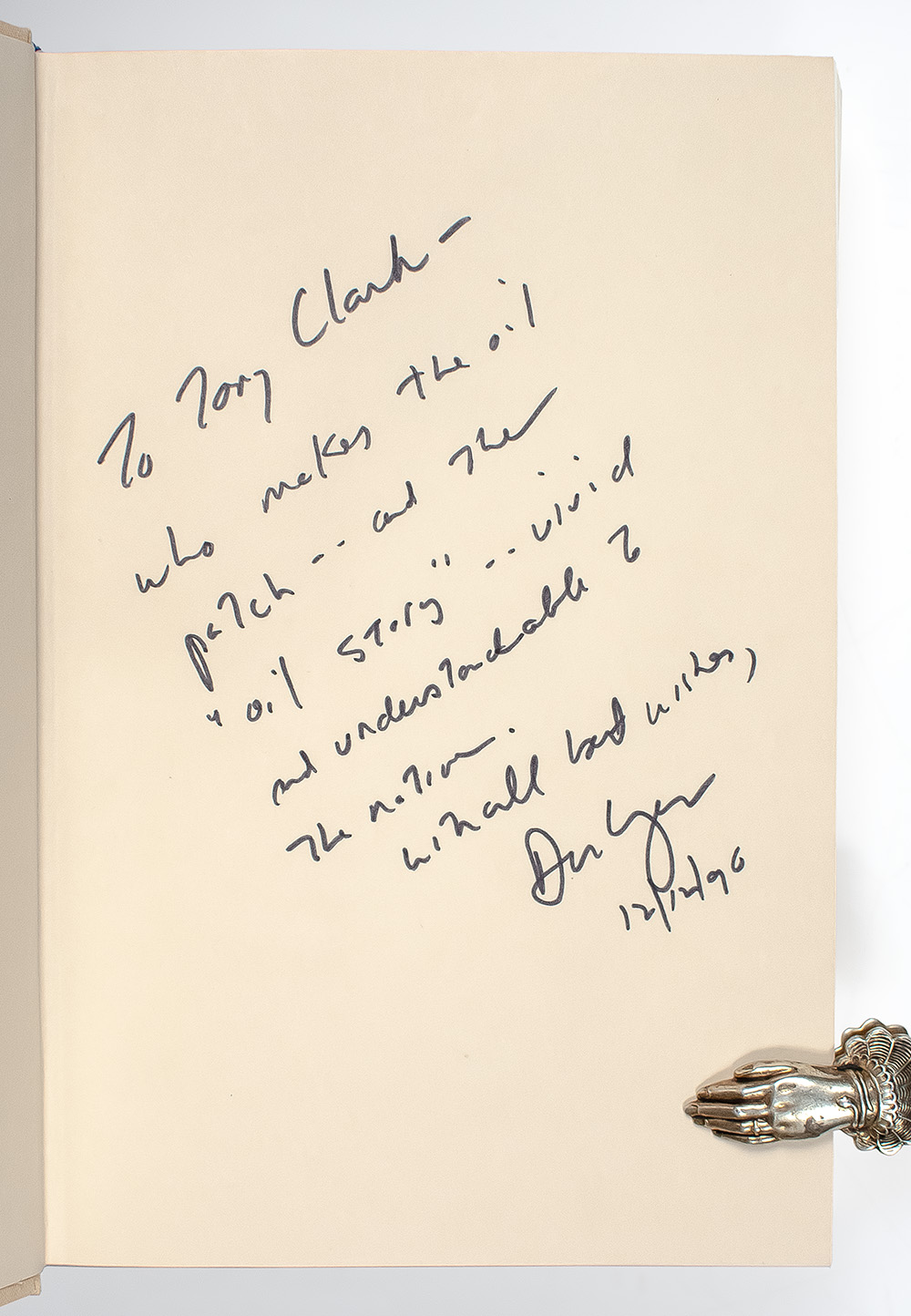 First edition of "the best history of oil ever written" (Business Week), which went on to win the Pulitzer Prize. Octavo, original half cloth. Presentation copy, lengthily inscribed by the author on the front free endpaper, "To Tony Clark who makes the oil patch -- and the 'oil story' vivid and understandable to the nation. With all best wishes, Daniel Yergin 12/12/96." The recipient, Tony Clark, has been a prominent figure in North Dakota energy development and regulation. The 'oil patch' is the region of northwestern North Dakota containing a vast oil reserve in the Bakken Formation. Harvesting of oil in the region vastly accelerated with the development of fracking processes. Fine in a near fine dust jacket. Jacket design by Robert Anthony.
