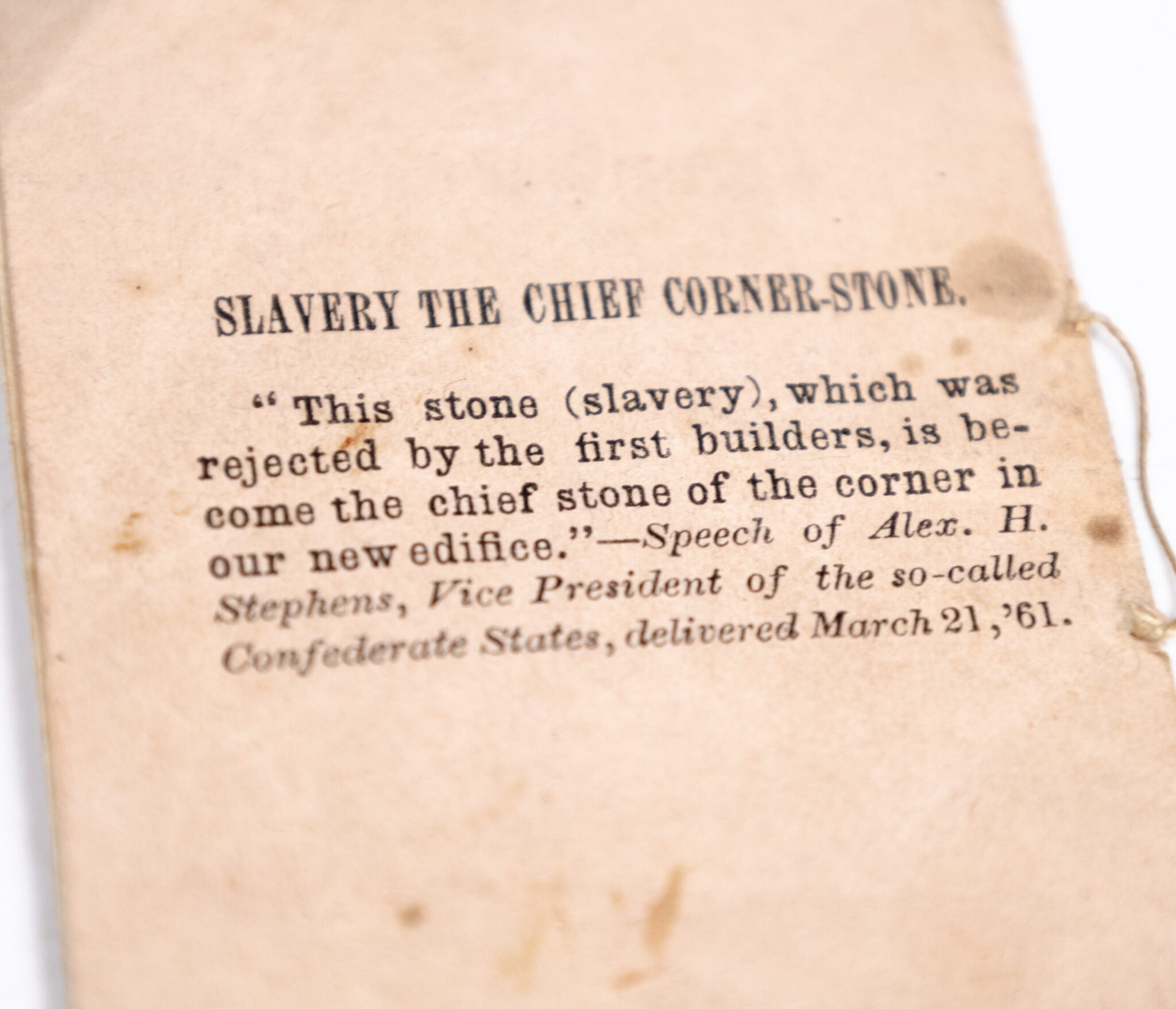 First and only printed pamphlet of the Emancipation Proclamation, produced for distribution to Union soldiers and African Americans (both enslaved and free) in December of 1862; the month preceding the issuance of the executive order. 16mo, original salmon wrappers as issued. In 1899, the publisher's daughter recalled the genesis of this pocket-sized edition: "With the view of placing the Proclamation of Emancipation in the hands of the negroes themselves, my father had printed copies on small slips, one and half inches square, put into packages of fifty each, and distributed among the Northern soldiers at the front, who scattered them about among the blacks, while on the march. [Massachusetts Senator Charles] Sumner approved the idea …" (Sara Forbes Hughes, Letters and Recollections of John Murray Forbes, pp. 348-49). Indeed, in a letter to Forbes of Christmas Day, 1862, Sumner asked, "Why not send to all the hospitals, camps, posts? The more the better?" John Murray Forbes was a Boston industrialist and an ardent abolitionist, who contributed to raising the celebrated 54th Massachusetts Volunteers, an African American regiment led by Colonel Robert Gould Shaw. In order to underline the key role of slavery in necessitating Civil War, Forbes had printed on the rear wrapper a quotation he attributed to "Alex. Stephens, Vice President of the so-called Confederate States": "This stone (slavery), which was rejected by the first builders, is become the chief stone of the corner in our new edifice." Given the rarity of this edition, it is likely that Forbes's daughter exaggerated the print run, as well as the diminutiveness, of her father's imprint—but the significance of his distribution scheme can scarcely be exaggerated. Eberstadt, Lincoln's Emancipation Proclamation 7; Monaghan, Lincoln Bibliography 147. In very good condition with the original thread binding. An exceptional example of this scarce and significant piece of Americana.